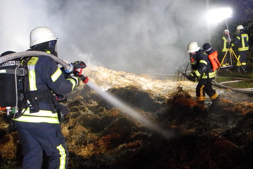 Durch die Erhöhung der Alarmstufe seien weitere Feuerwehrleute angefordert worden. „Bereits in der Anfangsphase des Einsatzes konnten zwei Trupps unter Atemschutz mit je einem C-Rohr die Halle erfolgreich abschirmen“, berichtet Florian Wöhrl, der Sprecher der Freisinger Feuerwehr. Während der Brand so rasch unter Kontrolle gewesen sei, „begannen kräftezehrende und aufwändige Nachlöscharbeiten“. Mit Hilfe eines Traktors sei das Stroh von dem abgebrannten Hänger geräumt worden. „Ausgebreitet und abgelöscht musste das Stroh jedoch von Hand werden.“ Hierzu seien insgesamt acht Trupps unter Atemschutz im Einsatz gewesen.