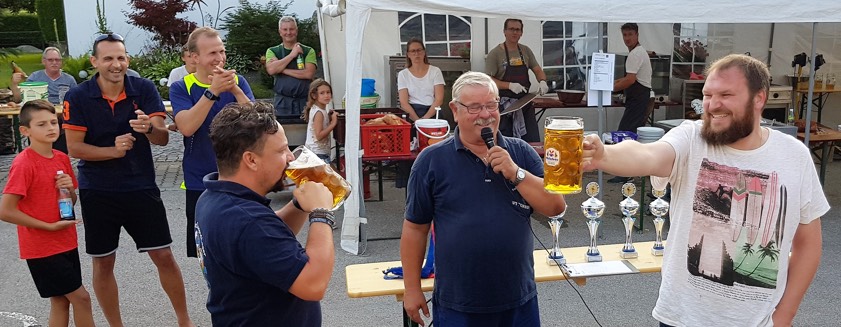 Um den vierten und fünften Platz mussten das THW Pfaffenhofen und das Team des BRK Pfaffenhofen wegen Gleichstands in einem Stechen beim Maßkrugstemmen antreten: Das BRK schickte dabei ihre Geheimwaffe „Girgl“ ins Rennen, der seinem Kontrahenden keine Chance ließ. Die rote Laterne übernahm diesmal die Feuerwehr Bruckberg. Schiedsrichter Horst Kaindl, Max Seemüller und Christian Moser hatten in der Betreuung der Wettkämpfe leichtes Spiel. In der lauen Sommernacht wurden die Turnier-Ergebnisse bei mancher Maß noch freundschaftlich diskutiert.