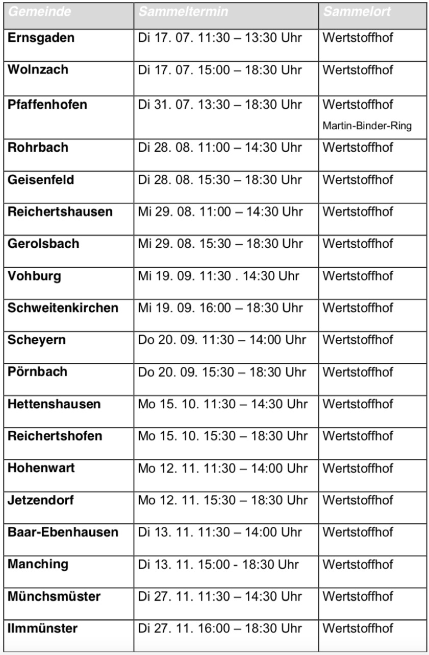 Hier die Termine zur Abgabe von Problem-Abfall: