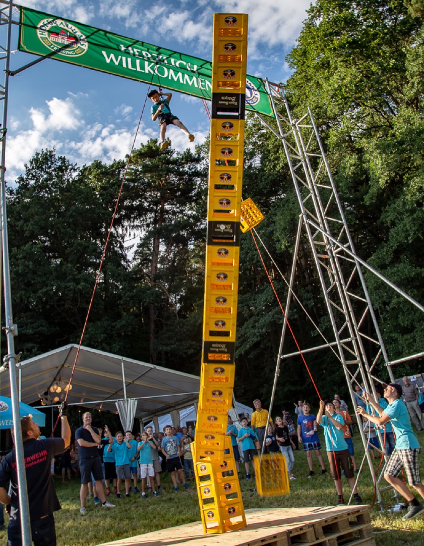 Bei vielfältiger Speise- und Getränkekarte sowie zünftiger bayerisch-böhmischer Musik der „Stoakirchana“ konnten die Gäste dann dem Schauspiel für Jung und Alt zusehen. Nach nicht allzu langer Zeit konnten die ersten jugendlichen Kraxler die diesjährige Höchstmarke von 25 übereinander gestapelten Bierkisten erklimmen. Die Erwachsenen taten sich etwas schwerer: nach höchstens 21 Kisten war für sie Schluss.