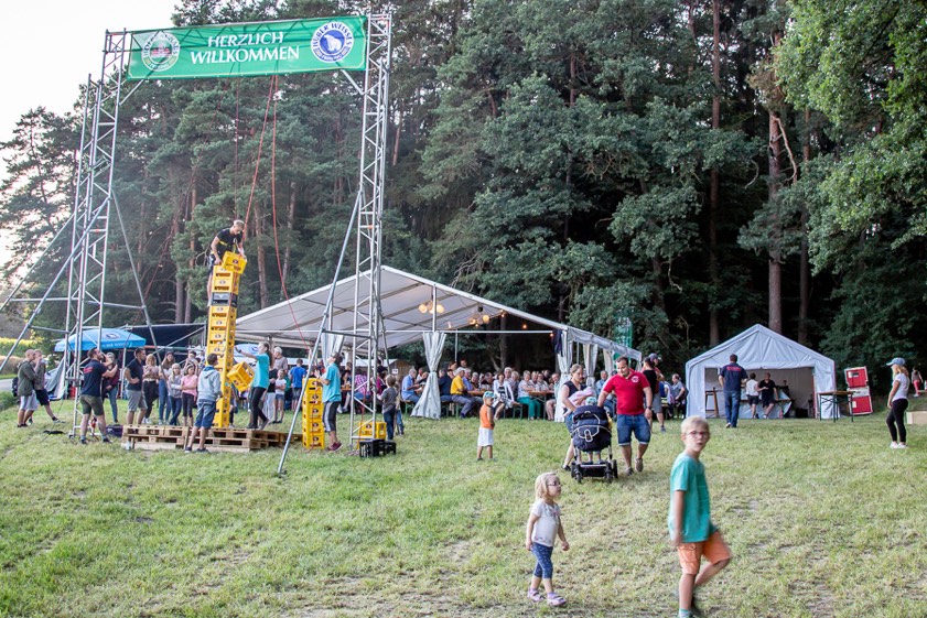 (ty) Im Reichertshausener Ortsteil Pischelsdorf hat die Freiwillige Feuerwehr ihr Waldfest mit „Kistnkraxln“ und „De Stoakirchana“ gefeiert. Seit Freitag waren ehrenamtlichen Helfer der Wehr mit dem Aufbau am Waldrand beschäftigt, damit am Samstagnachmittag alles bereit war: Festzelt, Grill-, Getränke- und Kuchenstände, Barzelt, Bühne und nicht zuletzt das acht Meter hohe Gerüst fürs Kistnkraxln.