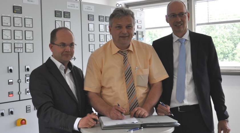 (ty) Die Warte des Bahnstrom-Kraftwerks Bertoldsheim bot die Kulisse für die offizielle Vertragsunterzeichnung zum Neubau der Donaubrücke der Kreisstraße ND 11 zwischen Bertoldsheim und Burgheim beim Kraftwerk Bertoldsheim (Foto unten). Landrat Roland Weigert unterzeichnete für den Landkreis Neuburg-Schrobenhausen, Roman Töpler und Peter Fösel als Vorstandsmitglieder der DWK (Donau-Wasserkraft AG), einem Gemeinschaftsunternehmen der Uniper-Kraftwerke-GmbH und der Rhein-Main-Donau GmbH. Seit knapp zwei Jahren laufen die konkreten Planungen und Verhandlungen zu dem Neubau, der nun wenige Meter flussaufwärts parallel zur bestehenden Betriebs-/Straßenbrücke zwischen Fischaufstiegsanlage und Wehranlage im Staubereich des Kraftwerks entstehen soll.