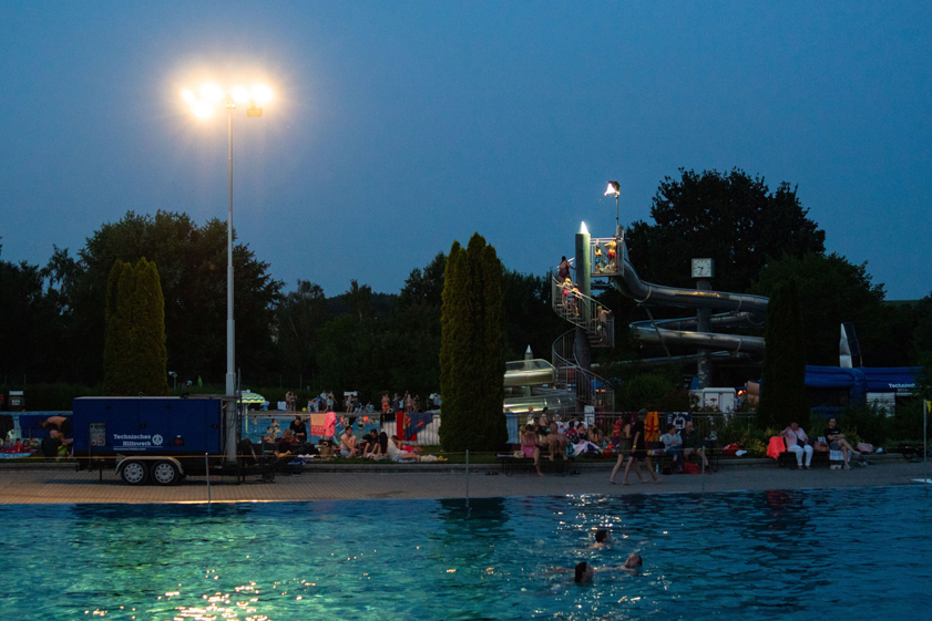 (ty) Das Nachtschwimmen im Pfaffenhofener Freibad war aus Sicht der Verantwortlichen auch in diesem Jahr ein voller Erfolg. Die Veranstaltung von Wasserwacht und THW startete am Freitag nach der regulären Bade-Zeit um 20 Uhr, der Andrang war enorm. „Wie im letzten Jahr hat das THW – neben der Beleuchtung – für leckeres Essen und Getränke gesorgt. Wer hungrig war, konnte sich zwischen Steaksemmeln, Wiener, Pommes und vielem mehr entscheiden. Die Bar war den ganzen Abend geöffnet“, freute sich der Wasserwachts-Vorsitzende Hans Postel über die gute Zusammenarbeit mit dem THW und meint: „Das nächste Nachtschwimmen ist schon in Planung. Es muss nur das Wetter mitspielen.“