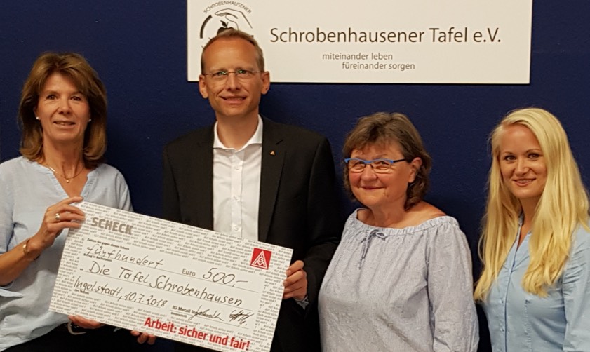 (ty) Mit einer Summe von 500 Euro unterstützt die IG-Metall die Schrobenhausener "Tafel" und hilft dabei bedürftigen Menschen die Not um Lebensmitteln zu mindern. Man wolle mit der Finanzspritze das vorbildhafte Engagement der Tafel unterstützen, sagte der Zweite Bevollmächtigte der IG-Metall Ingolstadt, Bernhard Stiedl. Die Schrobenhausener Tafel organisiert Lebensmittel für alle Mitbürger, die Sozialhilfe oder Arbeitslosenhilfe erhalten. Auch Empfänger kleiner Renten und jeder, der Hilfe dringend benötigt, wird unterstützt.