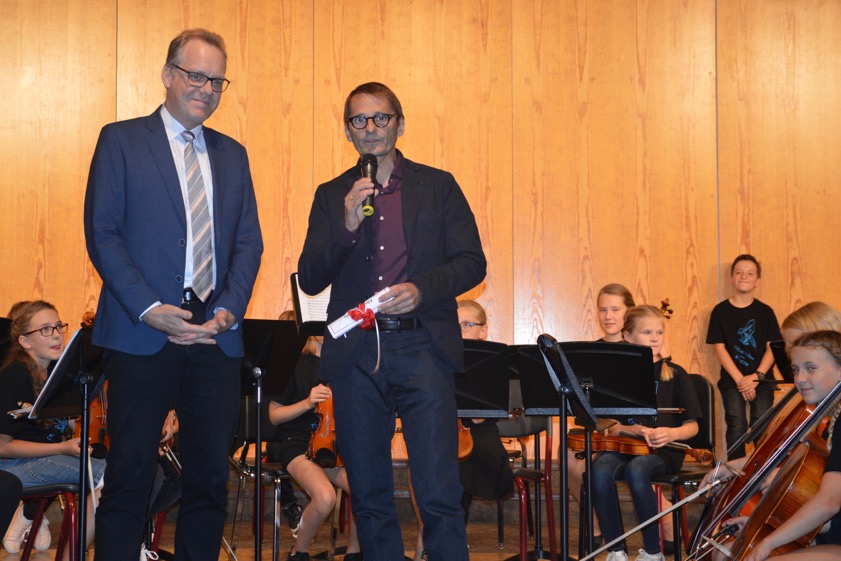 (ty) Mit 4000 Euro unterstützt die Sparkasse Pfaffenhofen die Streicher- und Forscherklassen am Pfaffenhofener Schyren-Gymnasium. Die offizielle Spenden-Übergabe erfolgte im Rahmen des traditionellen Sommerkonzerts an der Schule. Sparkassen-Vorstandschef Norbert Lienhardt (Foto oben, rechts) überreichte die Spende symbolisch an Schulleiter Dietmar Boshof (links). Der Bank-Boss betonte: Eine so schöne und musikalisch anspruchsvolle Veranstaltung sei der beste Beleg dafür, wie gut das Geld hier angelegt sei. Deshalb komme die Spende für die Nachwuchsmusiker und -forscher von ganzem Herzen.