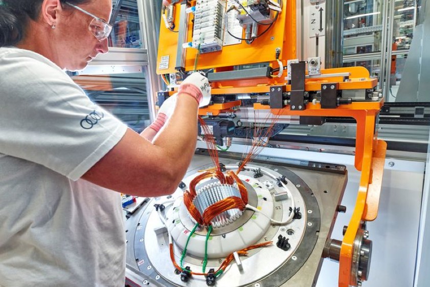 Der Elektromotor aus Győr bietet laut Audi zahlreiche Neuheiten. Beim Stator – einer der Kernkomponenten des E‑Motors – sei das Ziel, soviel des dünnen Kupferlackdrahtes in das Rohteil einzubringen wie möglich. Je enger die Wicklung, desto effizienter die Leistungsentfaltung. Ein neuartiges Wickel‑ und Einziehzentrum bei Audi Hungaria schaffe es, die optimale Menge an Kupferlackdraht besonders kompakt zu wickeln und anschließend in das Rohteil einzubringen. Die Elektro‑Achse bestehe aus weiteren großen Komponenten: zum Beispiel aus der Leistungselektronik, die in einem eigenen Gehäuse untergebracht ist, dem Getriebe sowie zwei Flanschwellen, die die Kraft zu den Rädern übertragen. Für den E-tron produzieren die Mitarbeiter je zwei elektrische Achsantriebe, da in Quattro‑Tradition sowohl Vorder‑ als auch Hinterachse angetrieben werden.