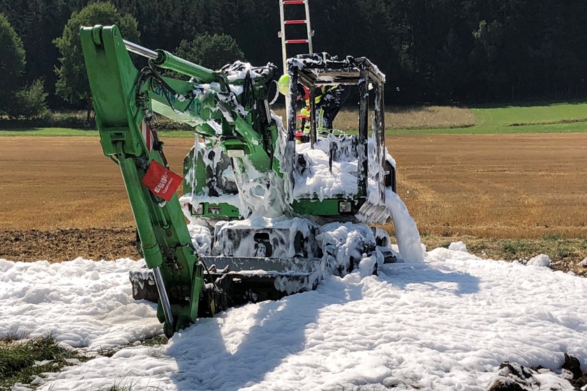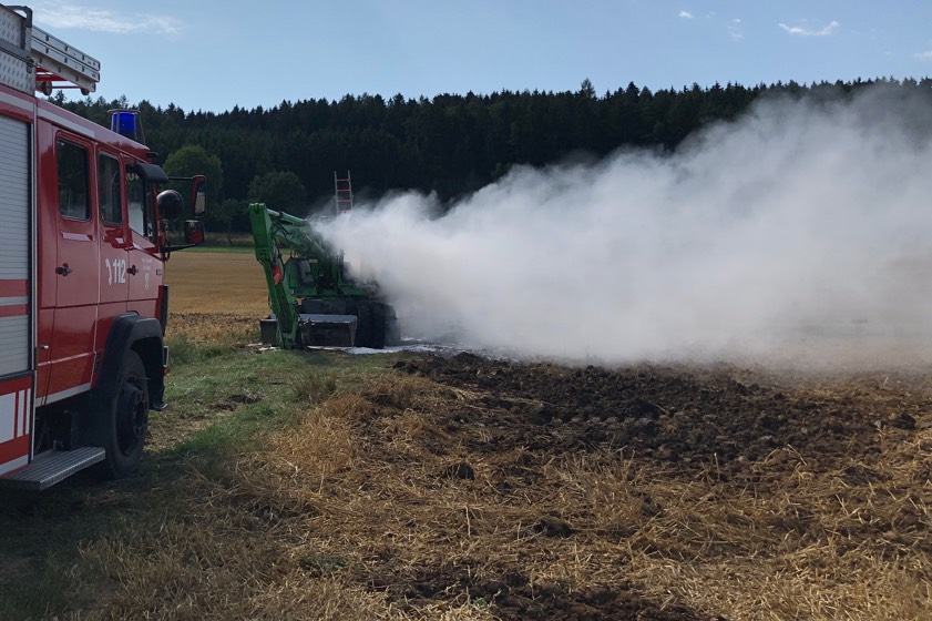 (aa) Gegen 10.20 Uhr sind am heutigen Vormittag die Feuerwehrleute aus Bad Abbach, Lengfeld und Teugn auf ein Feld am so genannten Liedlberg in der Nähe von Teugn (Kreis Kelheim) alarmiert worden. Weithin war eine mächtige Rauchsäule sichtbar, ein Bagger stand auf dem Feld im Vollbrand. Rund 40 Floriansjünger waren im Einsatz, löschen die Flammen unter Atemschutz mit jeder Menge Schaum ab.