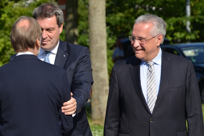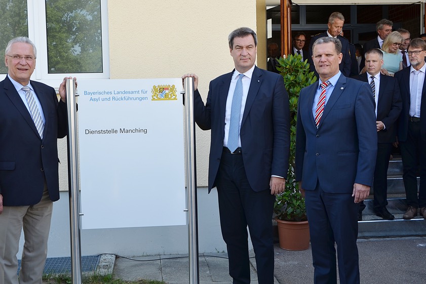 (ty) Heute Vormittag haben der bayerische Ministerpräsident Markus Söder (CSU) und Innenminister Joachim Herrmann (CSU) das neue "Landesamt für Asyl und Rückführungen" auf dem Gelände der Max-Immelmann-Kaserne in Manching-Oberstimm eröffnet. Laut Herrmann wird die Behörde mit Thomas Hampel als Präsident zum 1. August die Arbeit aufnehmen – gleichzeitig mit der Umwandlung der bestehenden sieben bayerischen Erstaufnahme-Einrichtungen in so genannte "AnkER"-Zentren. Damit soll es zu effizienteren und schnelleren Asyl-Verfahren kommen. "AnkER" steht für "Ankunft, Entscheidung, Rückführung". Während drinnen hochrangige Gäste einem Festakt beiwohnten, gab es vor dem Areal deutliche, aber friedliche Proteste unter dem Motto "Hier gibt's nix zu feiern". Der bayerische Flüchtlingsrat prangert eine "menschenfeindliche Politik" an.