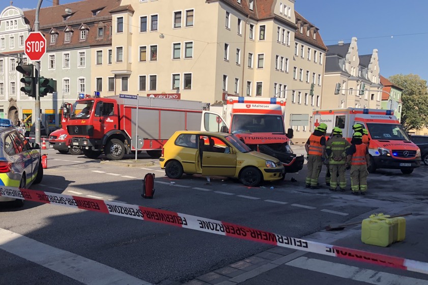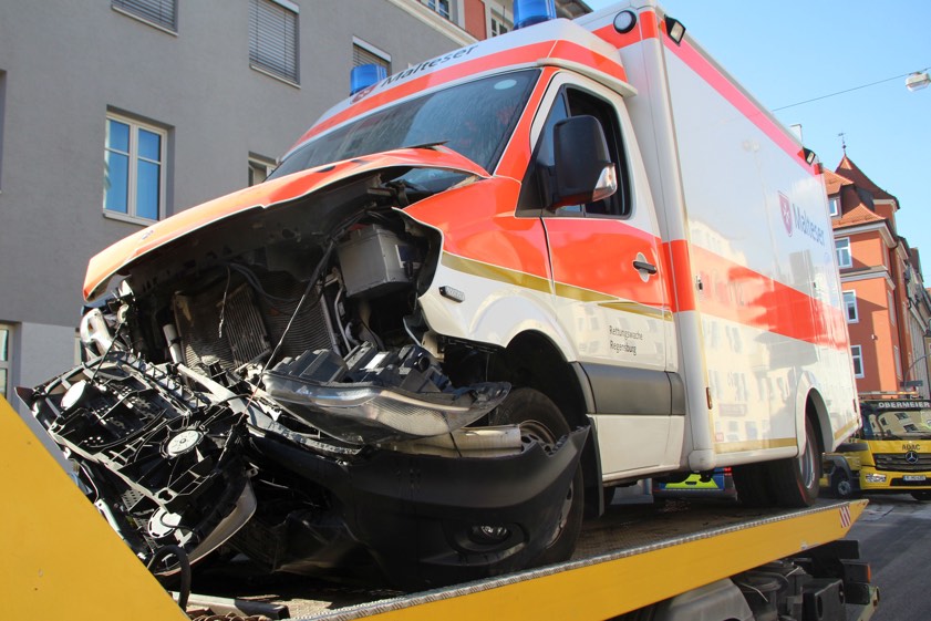 In einer Regensburger Kreuzung krachte gestern Nachmittag ein Rettungswagen, der bei Rot fuhr, mit einem Pkw zusammen.