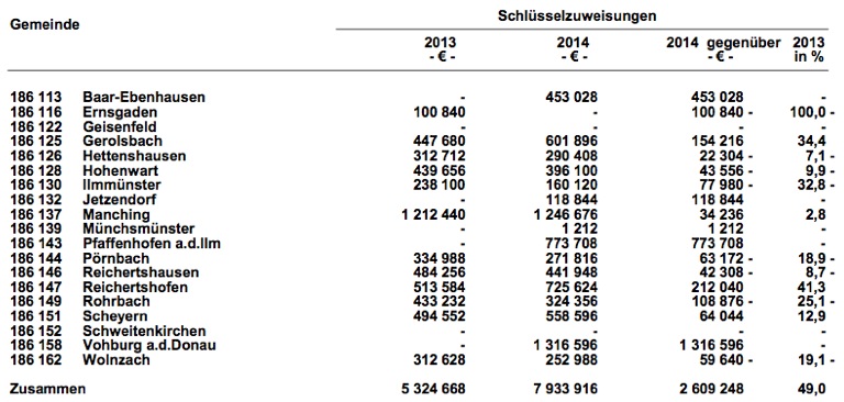 Schlüsselzuweisungen für nächstes Jahr: Der Landkreis bekommt 14,9 Millionen Euro, die Gemeinden erhalten zusammen 7,9 Millionen – am meisten kriegt Vohburg