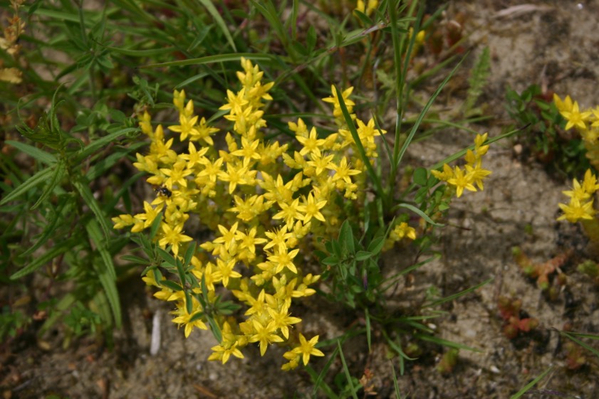 (ty) Bei Insekten sehr beliebt ist der Scharfe Mauerpfeffer, da sein Nektar für sie leicht zugänglich ist. Doch auch der Mensch weiß das Gewächs zu schätzen. Diese ausdauernde, krautige Pflanze heißt botanisch "Sedum acre" und gehört zu den Dickblatt-Gewächsen. Sie wird zwischen fünf und 15 Zentimeter hoch, hat ei-förmige Laubblätter und ist auch im Landkreis Pfaffenhofen zu finden. Ihre Blüte hat sternförmig angeordnete, goldgelbe Blütenblätter.
