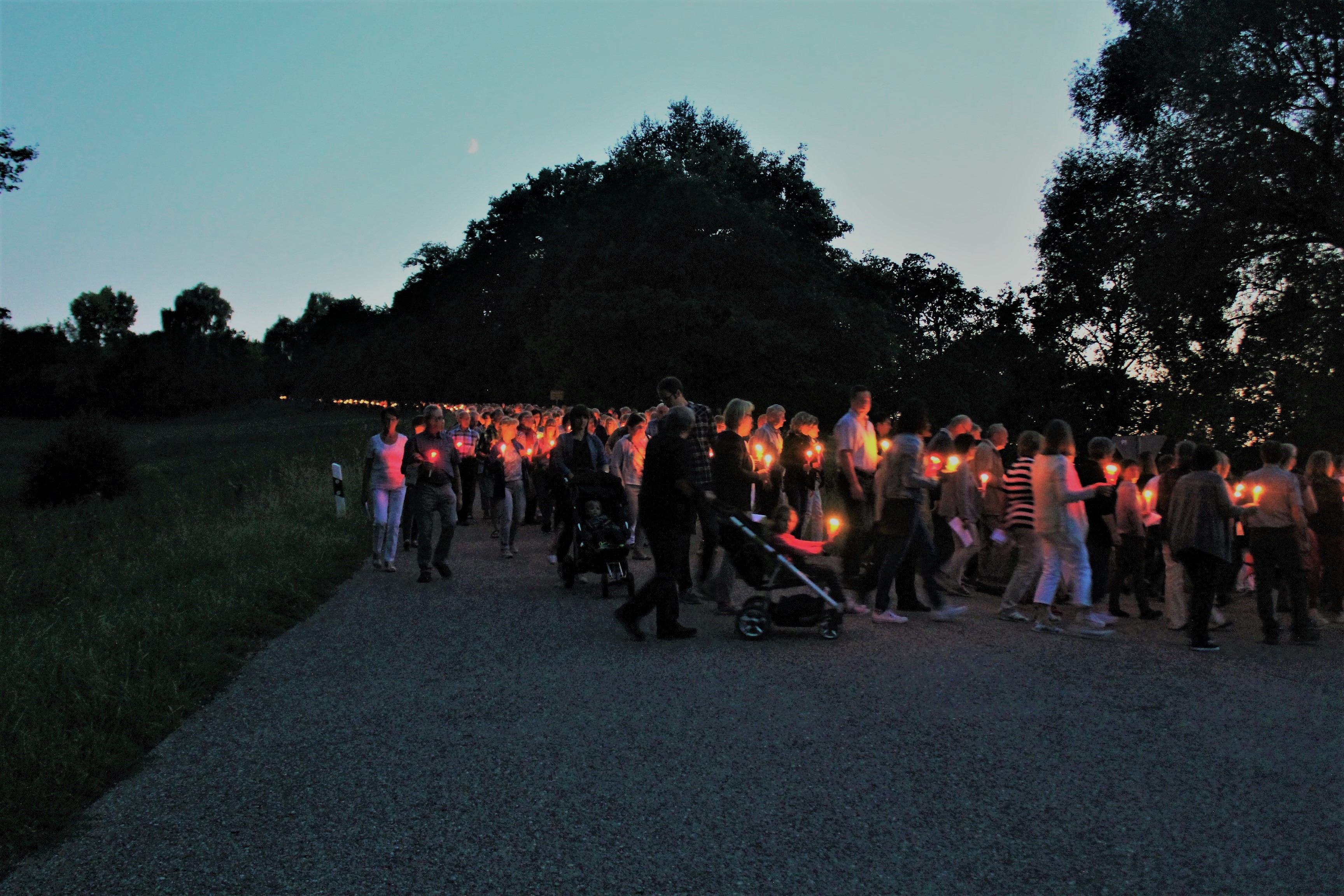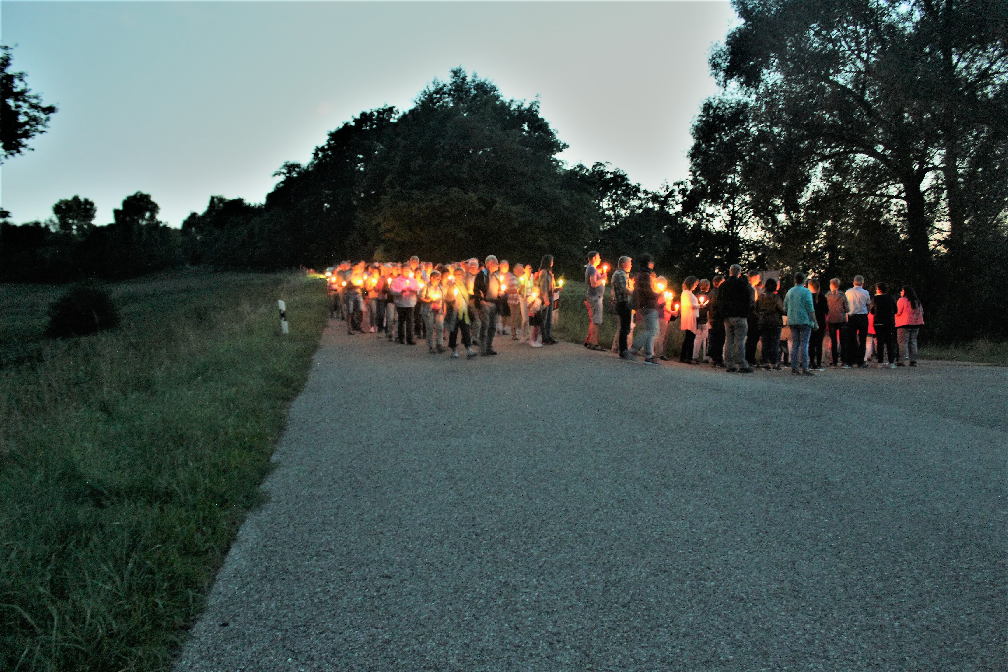 Viele positive Beispiele der bisherigen Hilfs-Aktionen des von ihr gegründeten Vereins „Solwodi“ sollten aber Mut machen, die Bemühungen weiter zu verfolgen. Da die Dämmerung inzwischen eingesetzt hatte, folgte mit der Lichter-Prozession der Abschluss der stimmungsvollen Andacht. Zahllose Kerzen wurden entzündet und begleitet von Rosenkranz-Gebeten und Marienliedern zog eine eindrucksvoll lange Menschenschlange einmal um den Steinerskirchener Berg.