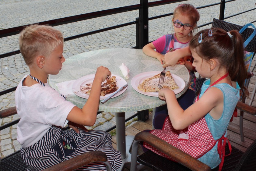 Doch das Ferien-Programm hatte noch mehr zu bieten. Für den Außenstehenden mag Gebärdensprache auf den ersten Blick äußerst kompliziert aussehen. Dass dem nicht so ist, bewiesen die Ferienkinder, die in kürzester Zeit mit den Händen sprechen und mit den Augen hören konnten. Ferner auf dem Ferien-Programm: Nutella-Crepes-Backen mit Hülya.