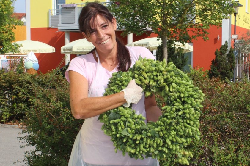 Ein nützlicher Nebeneffekt sind zudem die aus dem Hopfen gewonnen Produkte. In der Region ist es eine alte Tradition, sich einen Hopfenkranz zu binden und ihn sich in die gute Stube zu hängen. Dort prangst er dann bis zum nächsten Jahr, ehe ihn wieder ein frischer Kranz ablöst. Und so wurde auch in Hohenwart das grüne Gold der Hallertau kunstvoll in einen dekorativen Schmuck für das Senioren-Zentrum verwandelt. Nach getaner Arbeit gab es den Hopfen dann noch in flüssiger Form. Ein Bierchen geht schließlich immer.