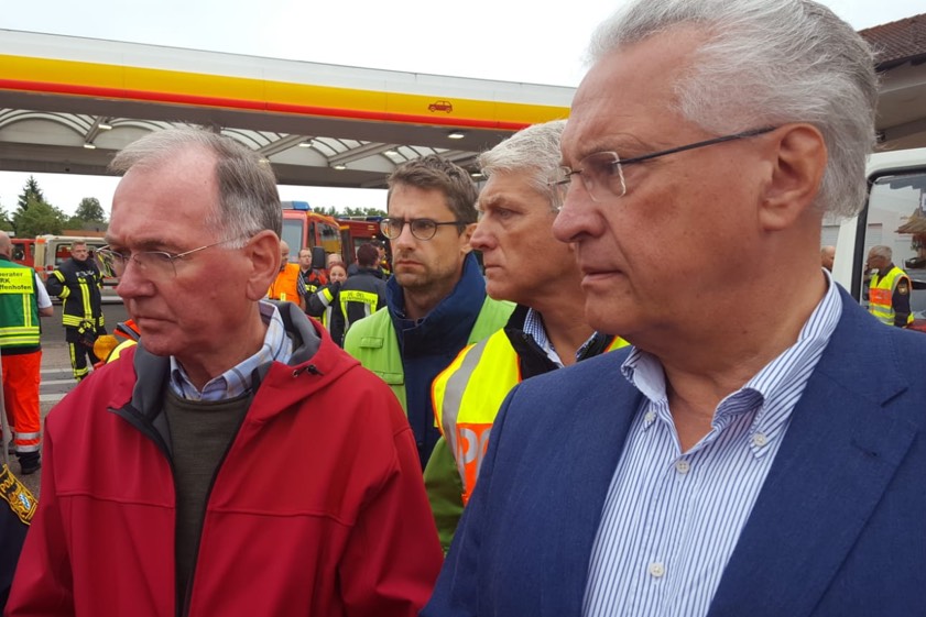 Inzwischen ist der bayerische Innenminister Joachim Herrmann (CSU) eingetroffen, um sich zu informieren. Mann könne "Gott sei Dank" sagen, dass es keine Toten gegeben habe, sagte er mit Blick auf die Verwüstung und die Schwere der Schäden. Außerdem attestierte er den Hunderten Helfern eine "reibungslose und perfekte Einsatz-Situation". Auch der Bundestags-Abgeordnete Erich Irlstorfer (CSU) und der Landtags-Abgeordnete Karl Straub (CSU) sind vor Ort. Gegen 10.10 Uhr teilte die Polizei mit, dass die Evakuierungs-Maßnahmen in Irsching und Knodorf inzwischen abgeschlossen seien.