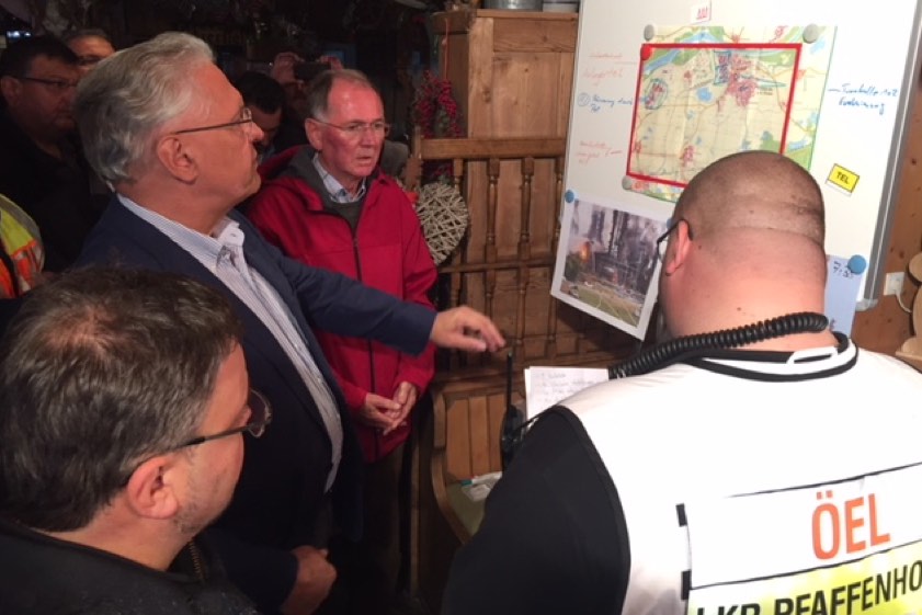 Vize-Landrat Anton Westner (rote Jacke), sichtlich betroffen, bei einer Besprechung mit dem bayerischen Innenminister Joachim Herrmann.