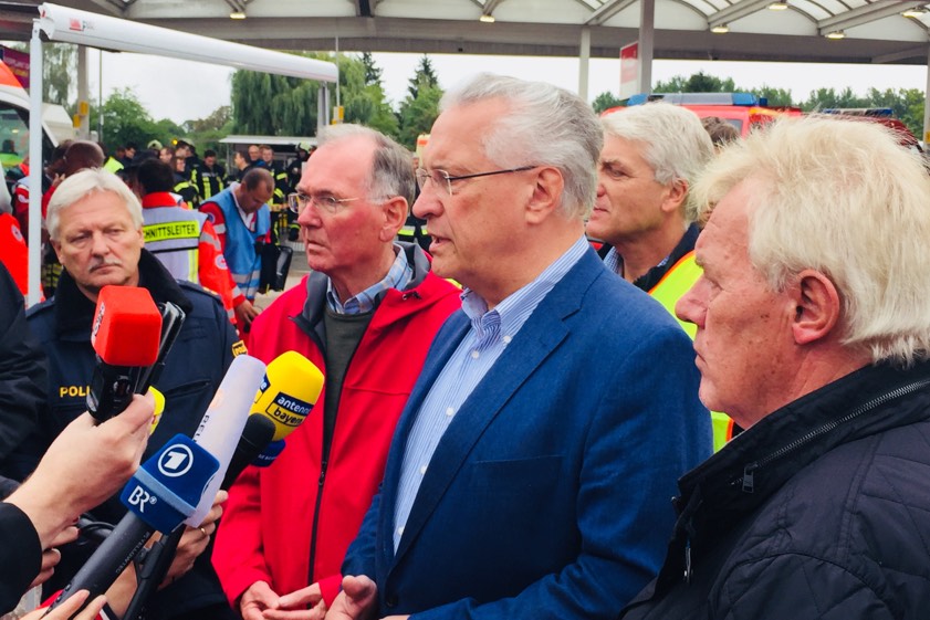 "Im Laufe des Vormittags herrschte rund um die örtliche Einsatzleitung in Rockolding ein stetiges Kommen und Gehen von Medien-Vertretern", erinnert sich Huber. Als bekannt geworden sei, dass gegen 10 Uhr der bayerische Innenminister Joachim Herrmann (CSU) nach Rockolding komme und etwas später auch Umweltminister Marcel Huber (CSU) eintreffen werde, sei kurz mit Vize-Landrat Anton Westner (CSU) – Landrat Martin Wolf (CSU) war urlaubsbedingt nicht da – und den Verantwortlichen der Polizei der Ablauf abgestimmt worden: Zunächst Lage-Besprechung, dann eine Stellungnahme vor den mittlerweile zahlreich anwesenden Medienvertretern und anschließend – wenn es die Lage erlaubt – ein Besuch am Unglücksort, um den Journalisten und Fotografen möglichst einen persönlichen Eindruck sowie Fotos zu ermöglichen.