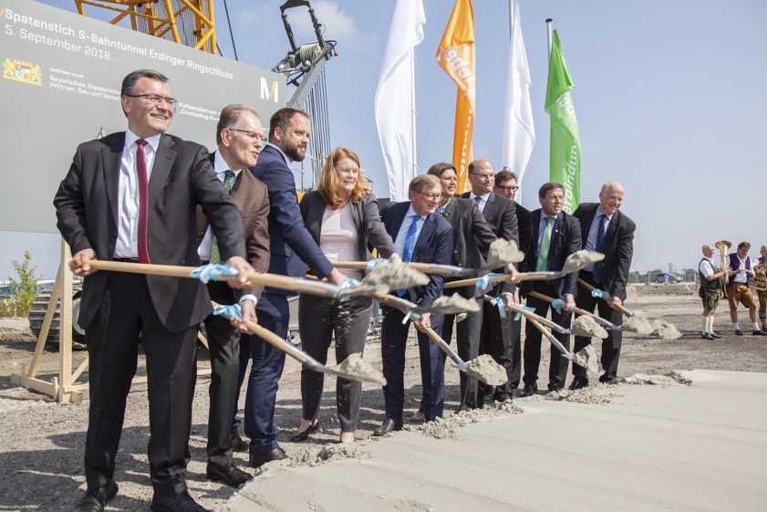 (ty) Offizieller Startschuss für den Ausbau des Bahntunnels am Flughafen München: Der bestehende Tunnel, der zurzeit auf Höhe des Terminal-2-Satelliten endet, wird in östlicher Richtung verlängert, um S-Bahnen und Fernzügen künftig das Durchfahren des Airports zu ermöglichen. Albert Füracker (CSU), Bayerns Finanzminister und Aufsichtsrats-Chef der Flughafen-München-GmbH (FMG), sowie die bayerische Verkehrsministerin Ilse Aigner (CSU) und der Vorsitzende der FMG-Geschäftsführung, Michael Kerkloh, führten heute gemeinsam den ersten Spatenstich für diese wichtige Baumaßnahme aus, mit der die Realisierung des Erdinger Ringschlusses – also die Durchbindung der Bahnstrecke von Freising über den Flughafen nach Erding – vorangetrieben wird.