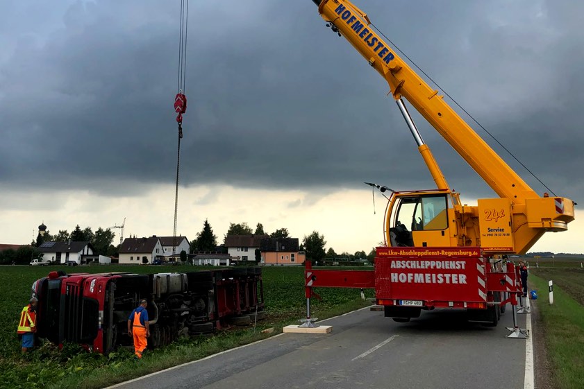 (aa) Am Montag kam ein Lkw auf der Regensburger Kreisstraße R8 bei Mötzing von der Strecke ab und kippte in einem nebenliegenden Zuckerrübenfeld um (Fotos). Laut Polizei wollte der 62-jährige Lkw-Fahrer einem entgegenkommenden Lastwagen ausweichen, hierbei geriet sein Lastzug ins Bankett und kippte daraufhin nach rechts um. Der Fahrer wurde leicht verletzt.