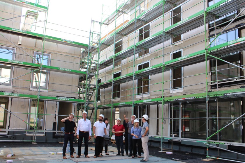 Wie WBG-Projektsteuerin Birgit Mitterhuber erläuterte, seien die Baumeister-Arbeiten der Firma „Irrenhauser & Seitz“ inzwischen beendet und der Anschluss an die Fernwärmeleitungen sei erfolgt. Bis Anfang Oktober, also rechtzeitig zum Beginn der Heizperiode, werde der Neubau komplett dicht sein, sodass der Innenausbau auch im Winter weitergehen könne.