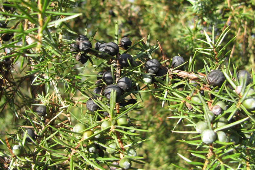 Der Wacholder dient als Gewürzpflanze und wird auch bei der Zubereitung von Wildgerichten verwendet. Er kann übrigens bis zu 800 Jahren alt werden und ist in Bayern auf der Vorwarnstufe der gefährdeten Pflanzenarten. In früheren Jahren wurden die Zweige an Weihnachten über die Stalltüren geheftet – und zwar, um böse Geister und Hexen fern zu halten.