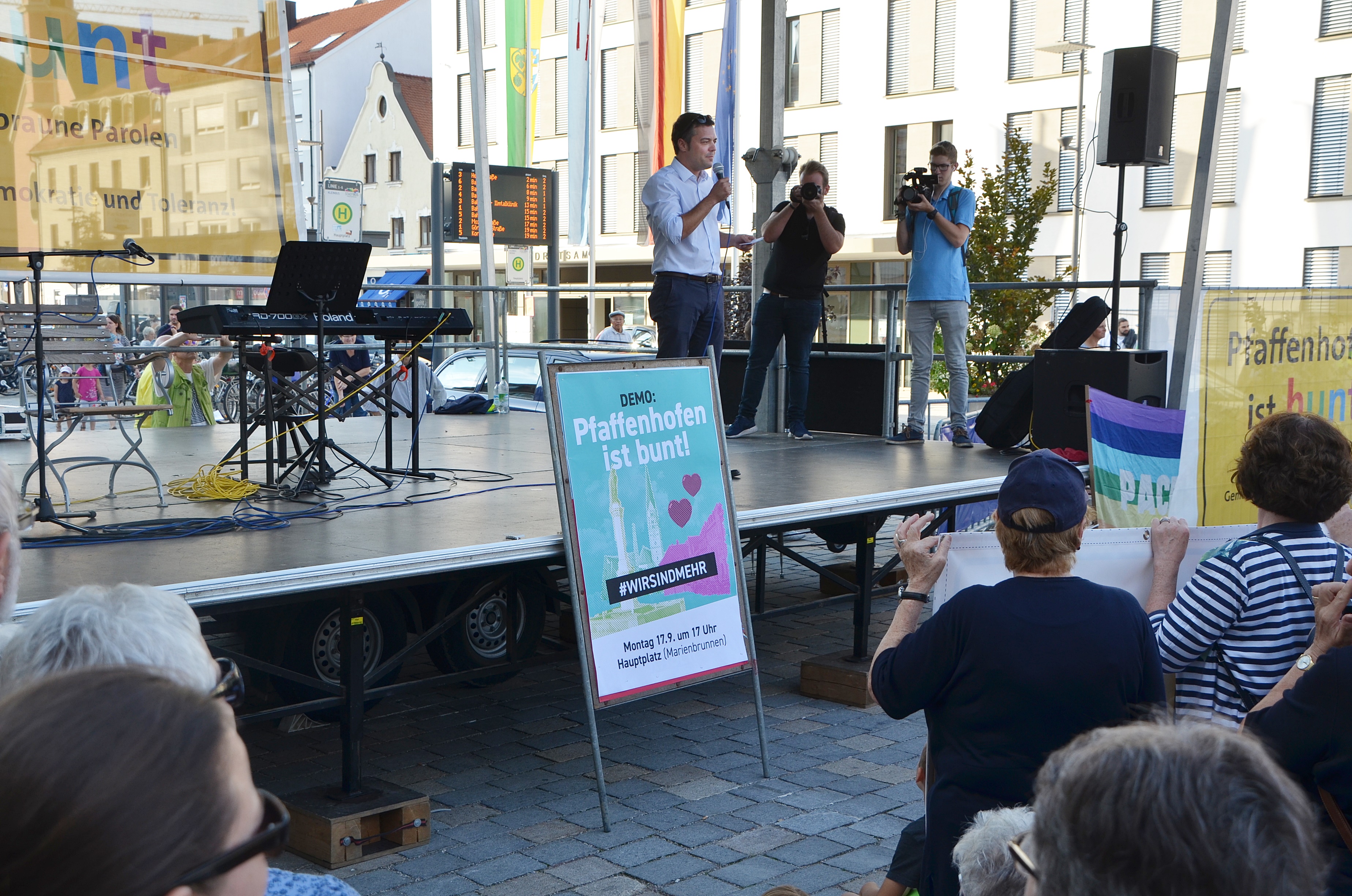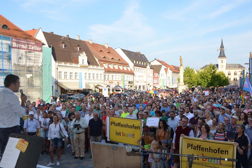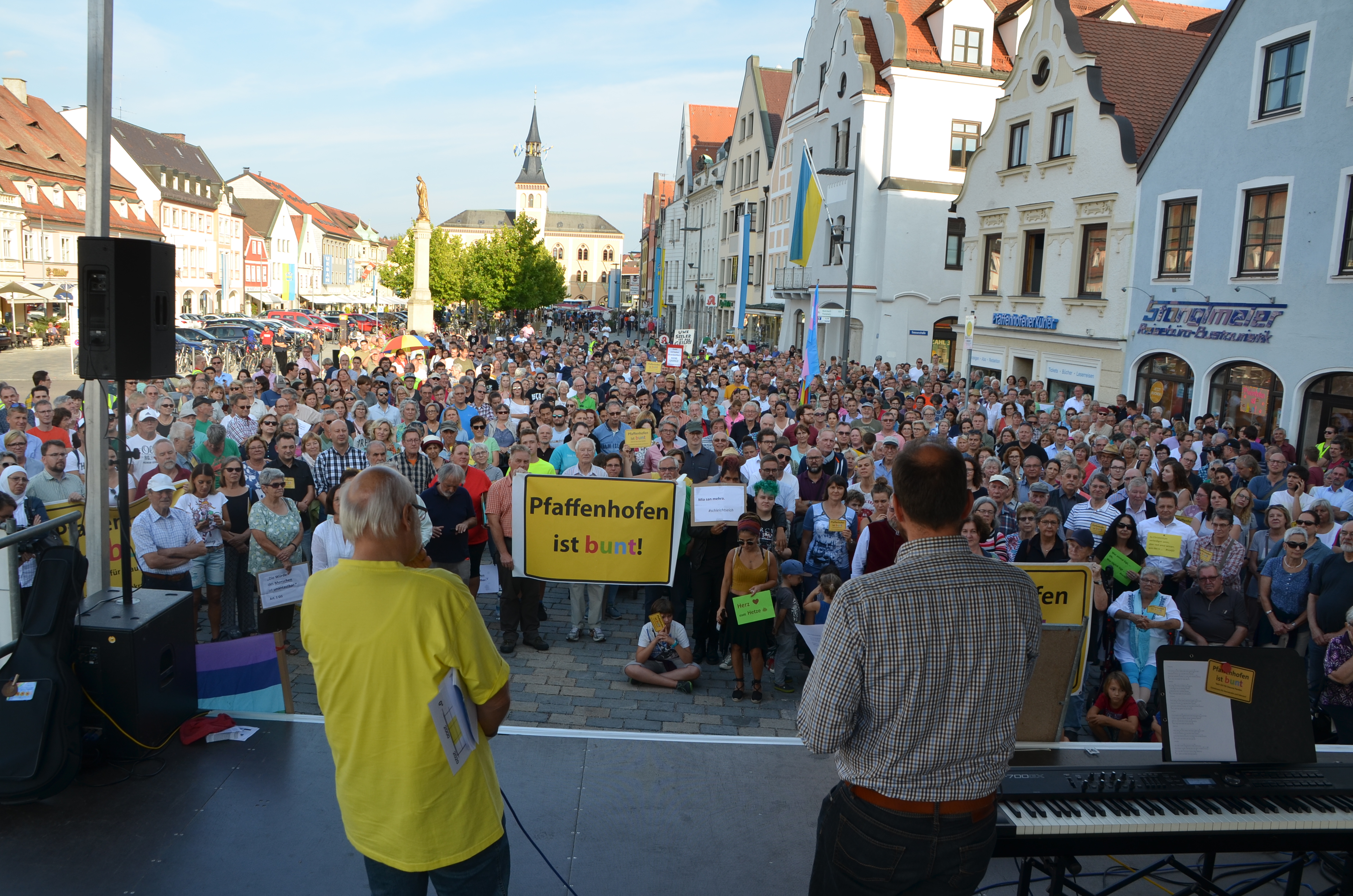 (ty) Mehrere hundert Leute sind heute Nachmittag zu einer Kundgebung auf den Hauptplatz gekommen, zu der das Aktions-Bündnis "Pfaffenhofen ist bunt" eingeladen hatte. Hintergrund war eine Wahlkampf-Veranstaltung der "Alternative für Deutschland" (AfD), die zeitgleich nur ein paar Meter weiter stattfand. Begleitet von Live-Musik, präsentierte "Pfaffenhofen ist bunt"-Versammlungsleiter Markus Käser – SPD-Kreischef und Landtags-Kandidat – auf der eigens aufgebauten Bühne gut ein Dutzend Redner, die sich in unterschiedlichen Beiträgen gegen rechte Parolen, Ausgrenzung und Rassismus aussprachen.