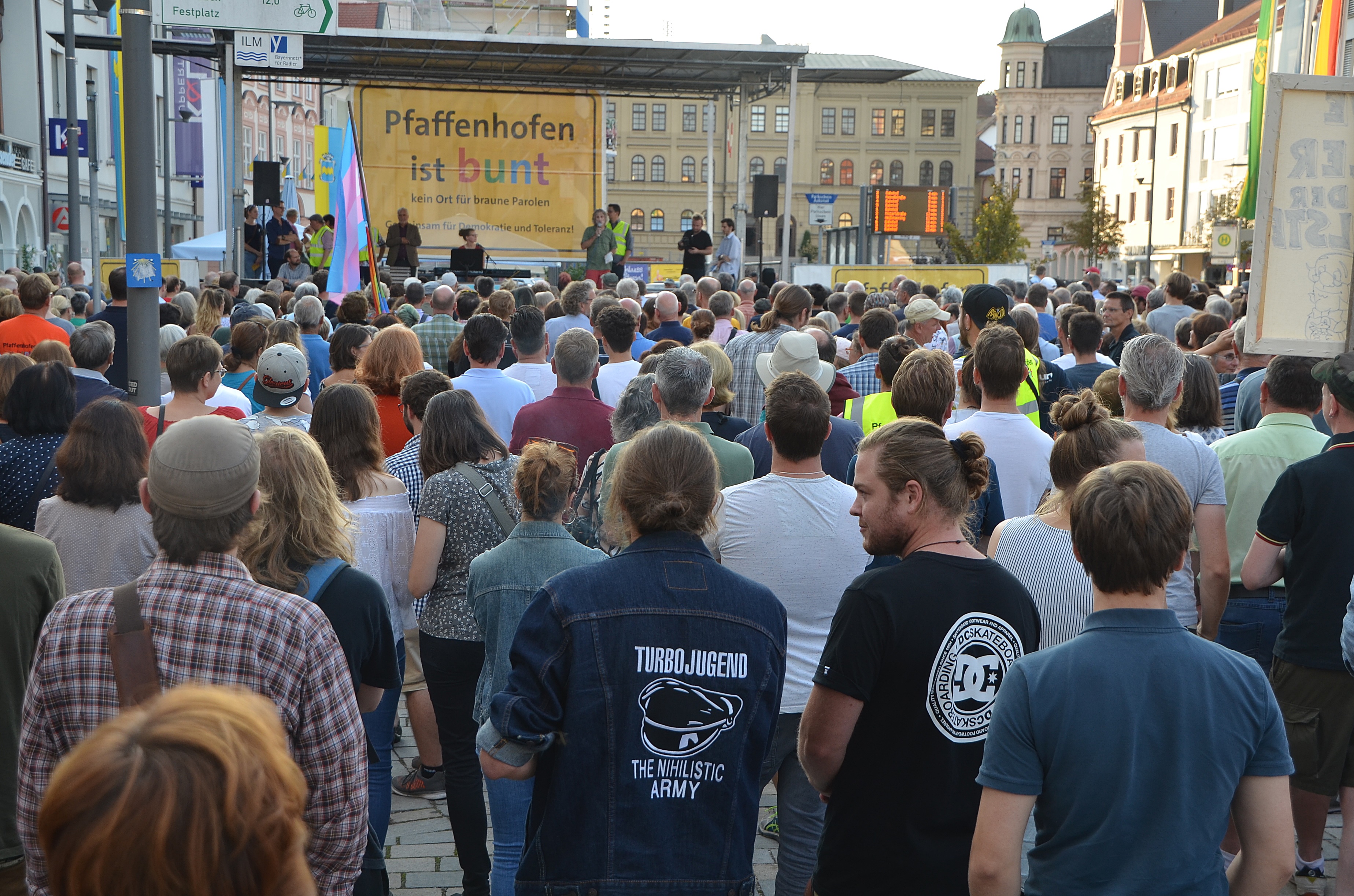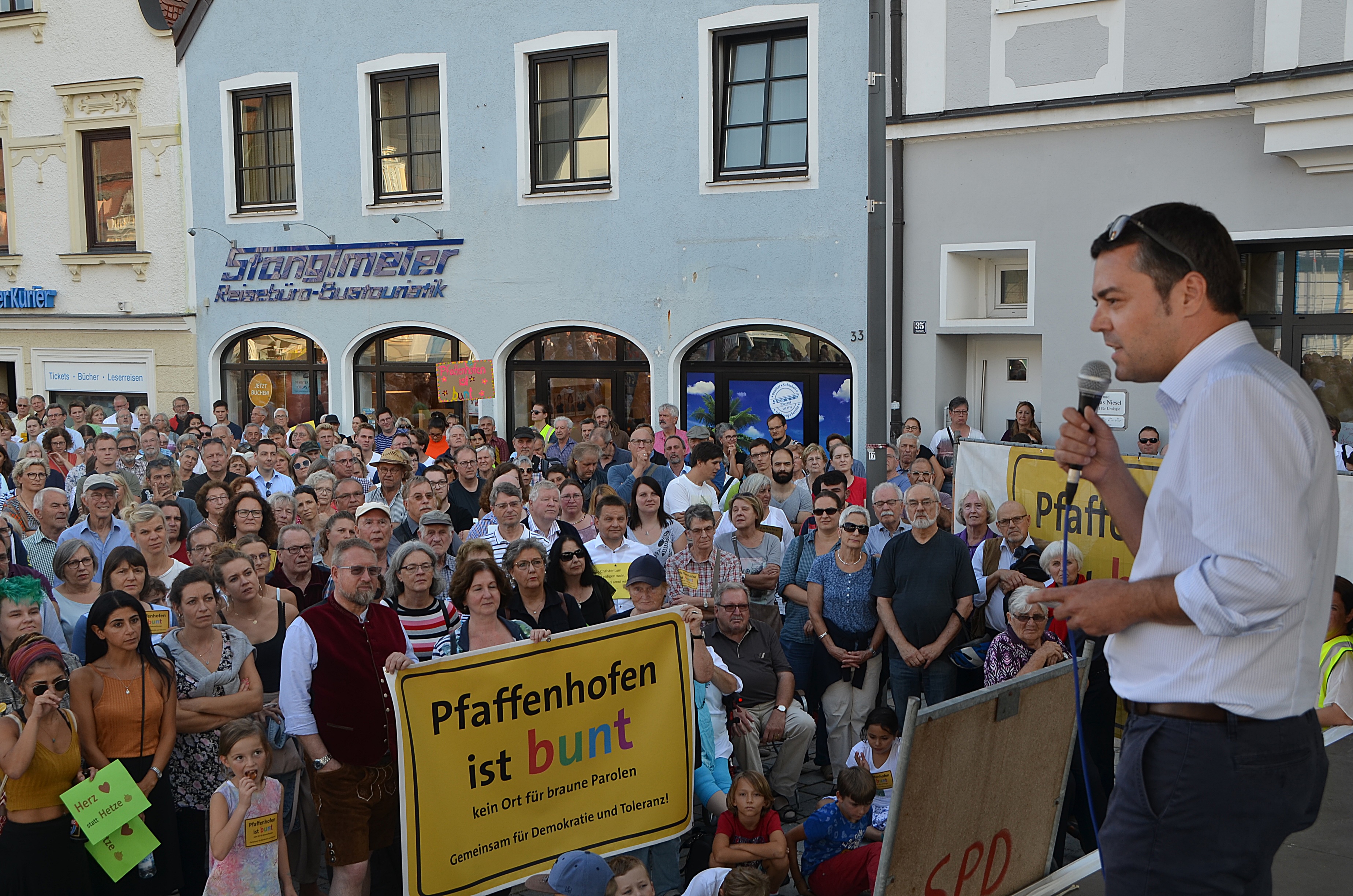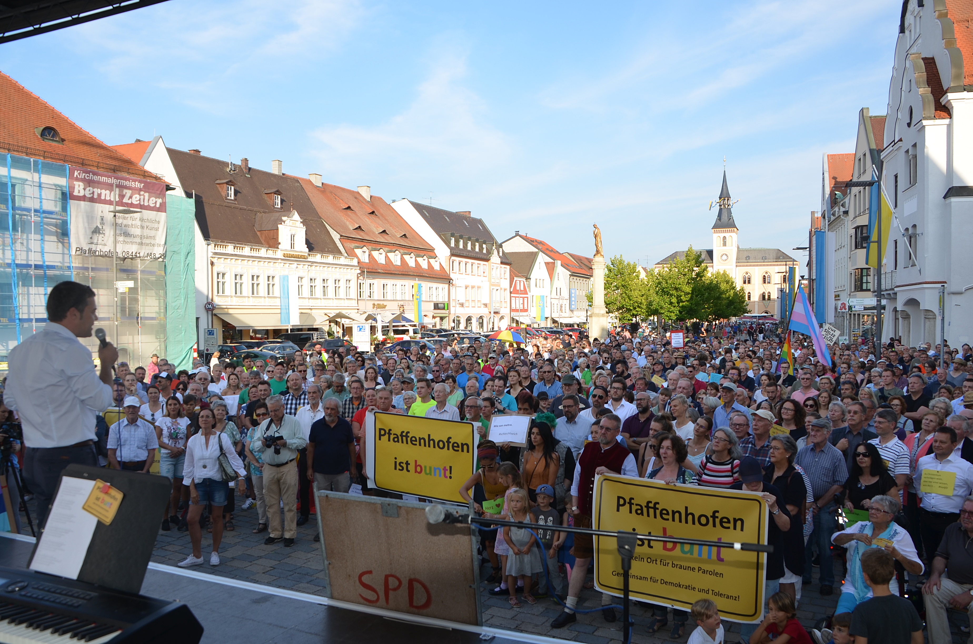(ty) Mehrere hundert Leute sind heute Nachmittag zu einer Kundgebung auf den Hauptplatz gekommen, zu der das Aktions-Bündnis "Pfaffenhofen ist bunt" eingeladen hatte. Hintergrund war eine Wahlkampf-Veranstaltung der "Alternative für Deutschland" (AfD), die zeitgleich nur ein paar Meter weiter stattfand. Begleitet von Live-Musik, präsentierte "Pfaffenhofen ist bunt"-Versammlungsleiter Markus Käser – SPD-Kreischef und Landtags-Kandidat – auf der eigens aufgebauten Bühne gut ein Dutzend Redner, die sich in unterschiedlichen Beiträgen gegen rechte Parolen, Ausgrenzung und Rassismus aussprachen.
