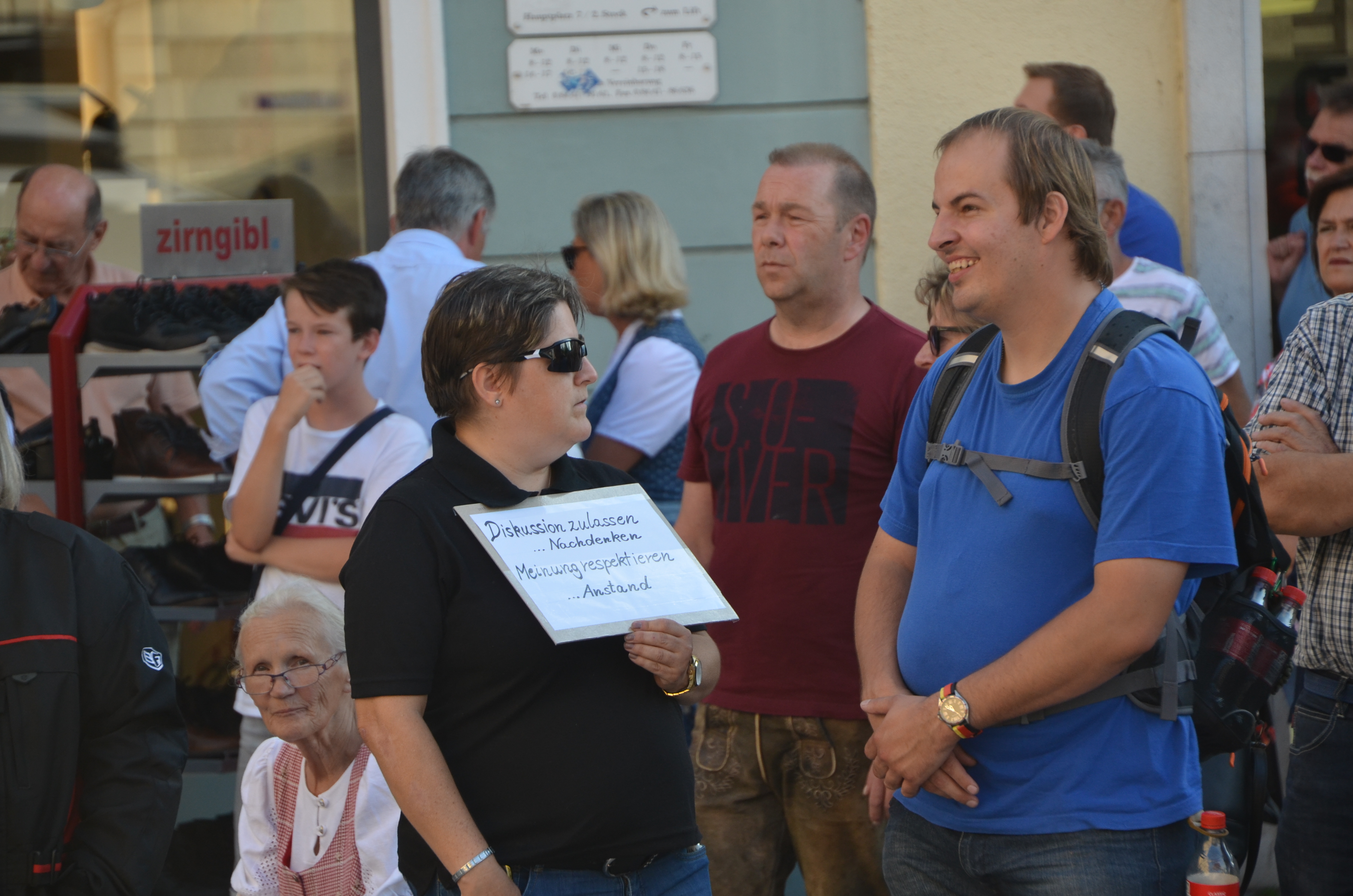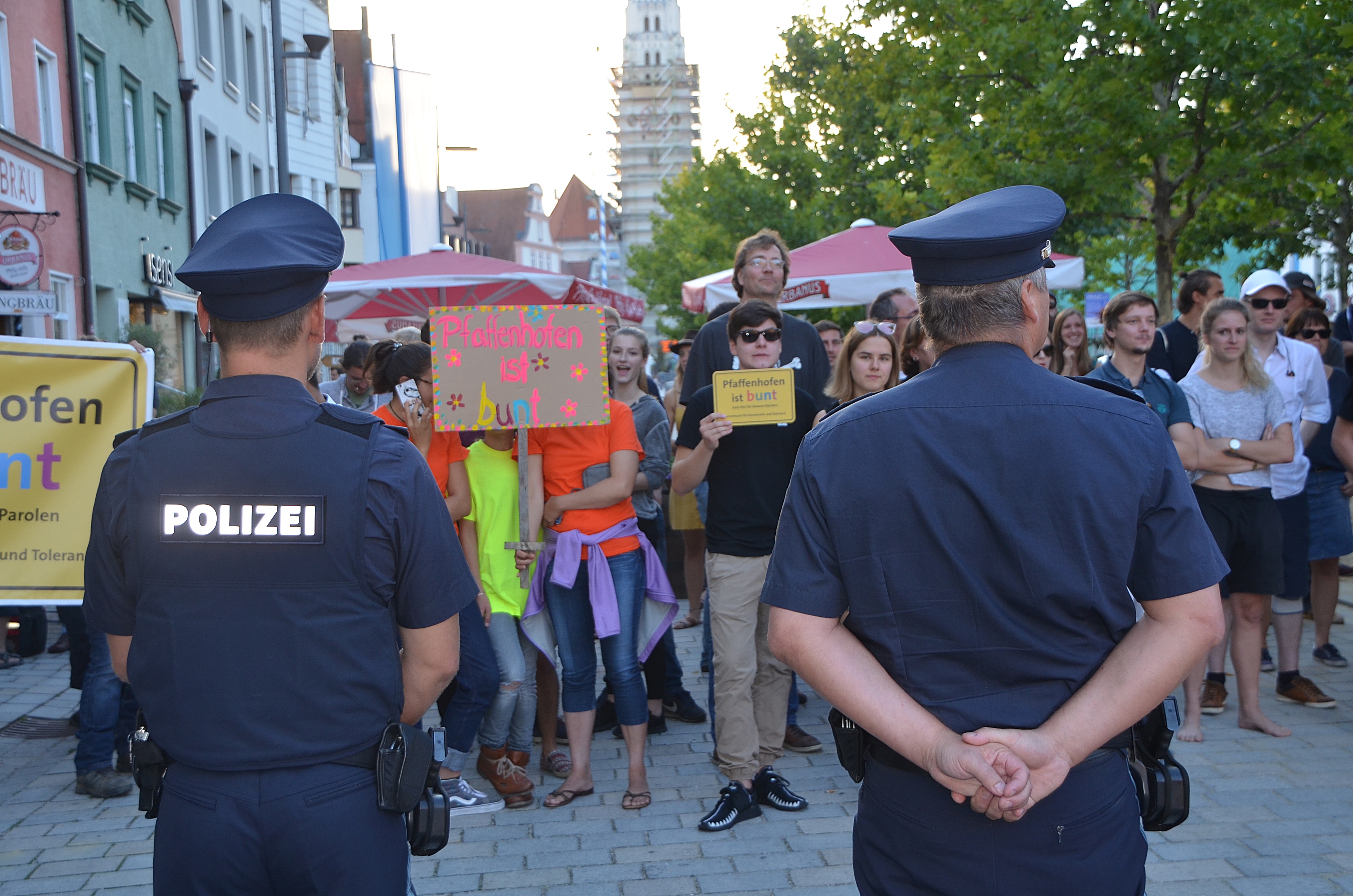 Ein explizites Motto hatte diese von dem überparteilichen Aktions-Bündnis organisierte Veranstaltung nicht. "Herz statt Hetze", war unter anderem aus der Menge zu vernehmen – das hätte im Sinne der Teilnehmer durchaus als Leitspruch gepasst. Auf der Bühne standen unter anderem die örtlichen Pfarrer George Spanos und Albert Miorin, Bürgermeister Thomas Herker, Vize-Bürgermeister und Landtags-Kandidat Albert Gürtner (FW), der Dritte Bürgermeister und DGB-Vertreter Roland Dörfler (Grüne), ÖDP-Stadtrat Reinhard Haiplik, GfG-Stadtrat Manfred "Mensch" Mayer und SPD-Kreisrat Florian Simbeck. Gekommen war auch die Landtags-Kandidatin Eva Bulling-Schröter (Linke) aus Ingolstadt.