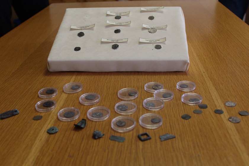 Daniel Speier zeigte sich selbst überrascht, als er nun erstmals den kompletten Fund vor sich liegen sah. Er zeigte auf eine Münze von knapp zwei Zentimetern Durchmesser und erklärte, es handle sich hier um einen Etschkreuzer aus Tirol. Aus dieser im Mittelalter wirtschaftlich mit Bayern stark verbundenen Region stamme fast ein Drittel der Münzen. Die restlichen Geldstücke seien in bayerischen Städten geprägt worden. So prangt auf manchen der Landshuter Helm, ein Augsburger Bischof oder der Mönchskopf von München, den man heutzutage eher als „Münchner Kindl“ kennt.