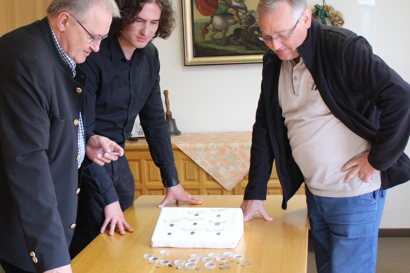 (ty) 31 mittelalterliche Silbermünzen liegen funkelnd auf dem Tisch des kleinen Sitzungssaals im Rathaus von Hohenwart und werden von Bürgermeister Manfred Russer (CSU) bestaunt. Neben ihm steht Daniel Speier, der den bisher nur in Teilen ausgestellten Fund in diesen Tagen komplettiert hat. Schon im Jahre 2004 war er mit seinen beiden Freunden André und René Carrié im Rathaus erschienen und hatte – als damals zwölfjähriger Bub – stolz den Fund einiger dieser uralten Münzen präsentiert.