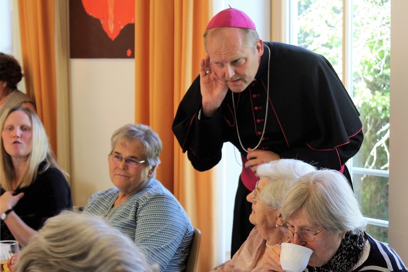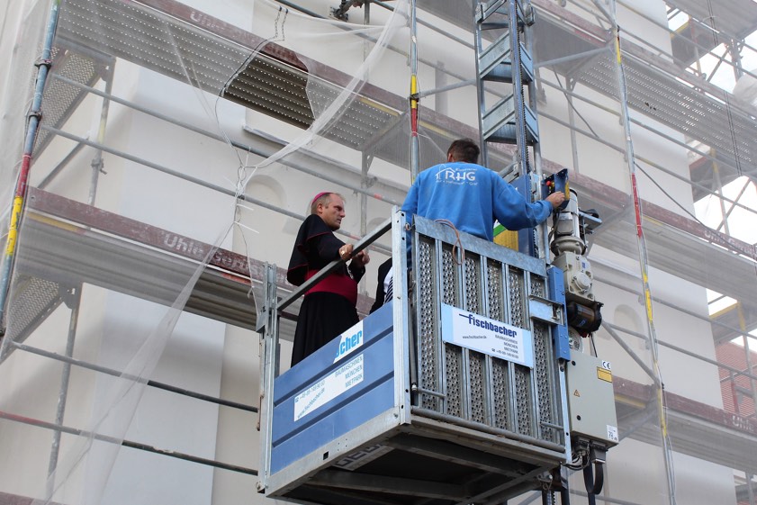 Das Angebot, die neue Glocke und das neue Dach von oben zu besichtigen, konnte Wörner einfach nicht ablehnen – und so ging es Getreu dem Motto „Näher, mein Gott, zu dir“ mit dem Lift ganz nach oben. Nach einem kurzen Rundblick auf das Paartal ging es dann auch zügig wieder nach unten. Die Senioren waren über die kurze Verspätung des Kirchenmannes jedoch keineswegs verstimmt, hatten sie doch erstmals einen Bischof „gen Himmel fahren“ gesehen – und außerdem nahm sich Hochwürden dann extra viel Zeit, um mit allen Anwesenden einen Plausch zu führen.