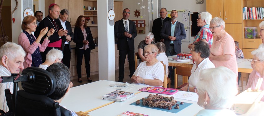 Anschließend erklärte Wörner, welche Aufgaben ein Bischof hat, warum er eine spezielle Bischofs-Kleidung mit Mitra trägt und was es mit dem Hirtenstab auf sich hat. Ein gemeinsames Gebet und die Segnung der Kinder beschlossen diesen Besuch. Direkt danach ging es weiter zur umfangreichen Besichtigung der Regens-Wagner-Einrichtung. Die Visitation beinhaltete hier den Besuch der Werkstätten, des Senioren-Wohnheims, der Pflege-Einrichtungen und auch der Schule.