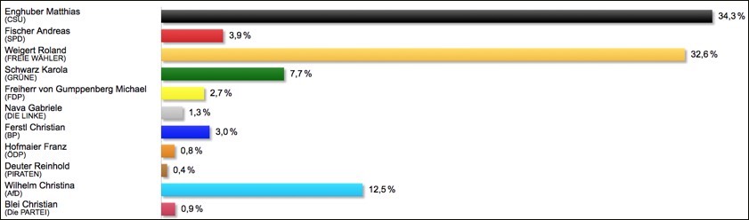 21.00 Uhr: Vergleichsweise schwach ist das Ergebnis von Straub (CSU) in Rohrbach, er kommt hier auf 33,7 Prozent, während vier Mitbewerber fast gleichauf liegen. Schäch (FDP): 12,9 Prozent, Reim (Grüne): 12,6 Prozent, Gürtner (FW): 12,3 Prozent, Teich (AfD): 11,7 Prozent.