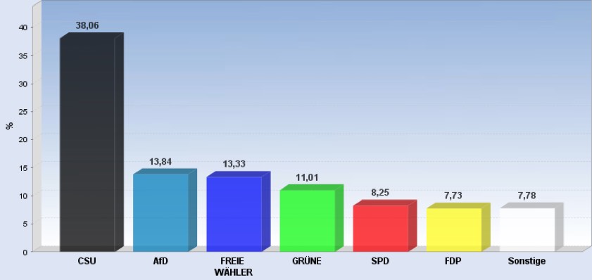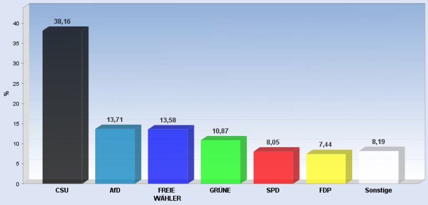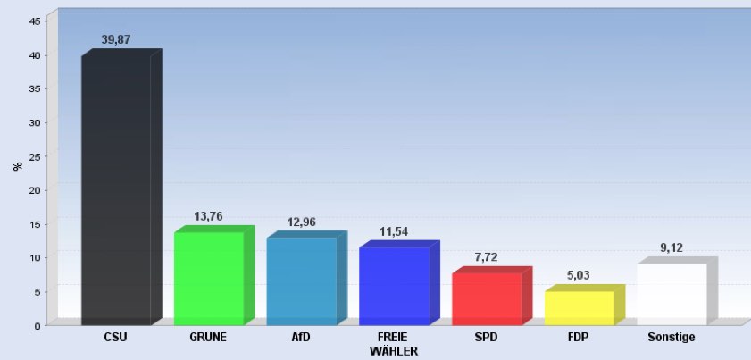 19.57 Uhr: Rund 39,5 Prozent für Straub (CSU) hat Straub in Baar-Ebenhausen eingefahren – so das vorläufige Ergebnis. AfD-Kandidat Tobias Teich kommt auf 14,8 Prozent, Albert Gürtner (FW) auf 13,8 Prozent. Grünen-Kandidat Wilhelm Reim kommt auf gut neun Prozent, Markus Käser (SPD) auf 8,7 Prozent. Der FDP-Mann Josef Schäch fährt 6,1 Prozent der Erststimmen ein. Zweitstimmen-Sieger in dieser Gemeinde: Die CSU mit 39,3 Prozent.