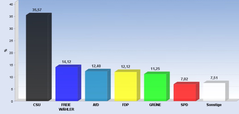 18.32 Uhr: Das Bayerische Fernsehen veröffentlicht die jüngste Hochrechnung: CSU 35,3 Prozent (minus 12,4 Prozentpunkte), SPD 9,9 Prozent (minus 10,7), Freie Wähler 11,6 Prozent (plus 2,6), Grüne 18,5 Prozent (plus 9,9), FDP 5,1 Prozent (plus 1,8), Linke 3,5 Prozent (plus 1,4), AfD 10,9 Prozent.