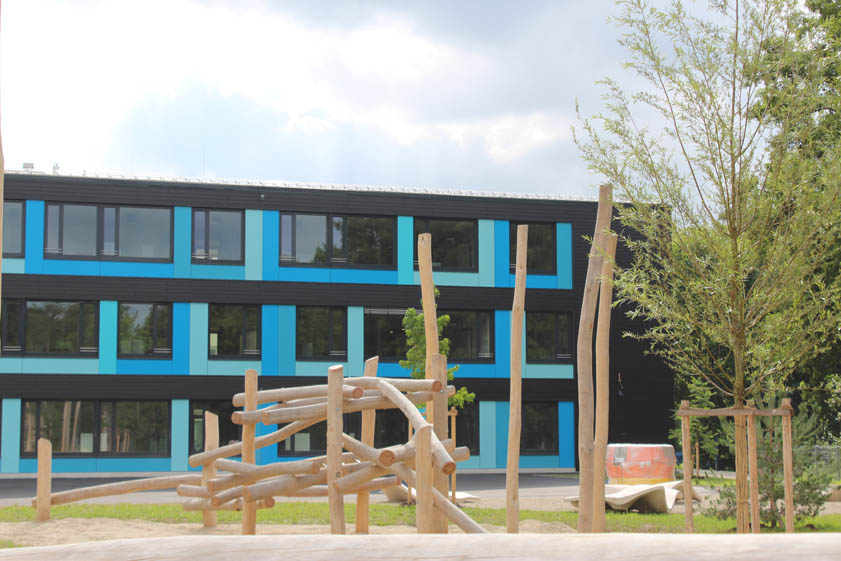 Der Neubau ist ein kompaktes, dreigeschossiges Gebäude mit einem zentralen Bereich sowie zwei Seitenflügeln samt Innenhöfen. Vier lichtdurchflutete Treppenhäuser erschließen die oberen Stockwerke. Das gesamte Gebäude ist barrierefrei zugänglich; zentral im Gebäude befindet sich der Aufzug. Eine hochwertige Ausstattung, unter anderem mit Holzfußböden, Holztreppen und Sichtbeton, zeichne den Neubau ebenso aus wie eine sehr helle und freundliche Atmosphäre. Hochwertig und modern ausgestattet seien auch sämtliche Fachräume und die beiden Lernwerkstätten.