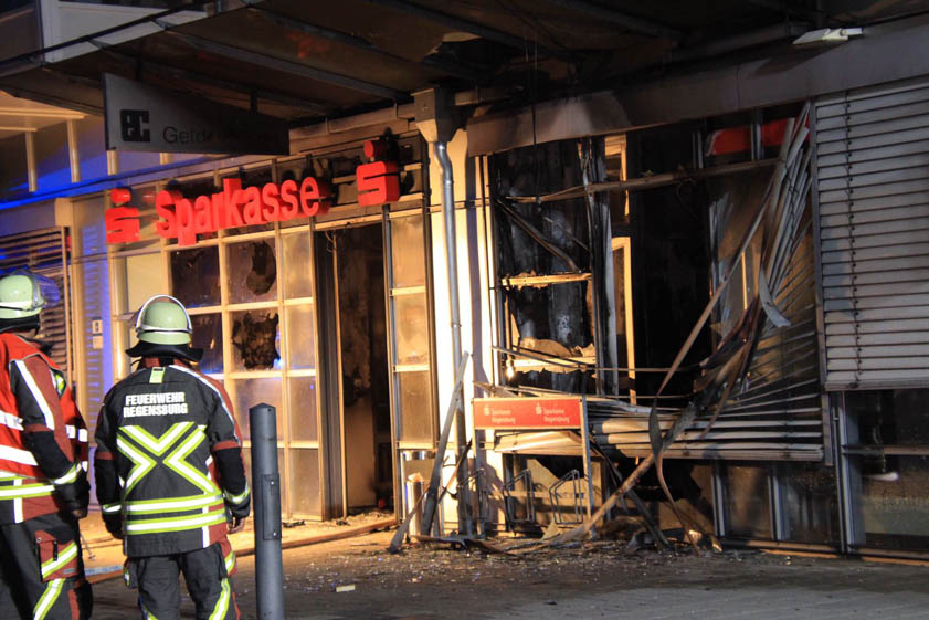 (ty) In der Nacht zum 13. September war – wie berichtet – in einer Bank in Regensburg ein Geldautomat gesprengt worden (Foto oben). Nun setzte die Sparkasse eine Belohnung für Hinweise zur Täter-Ermittlung aus. Die Kriminalpolizei sucht indes weiterhin Zeugen. Damals war gegen 1.30 Uhr der Geldautomat einer Sparkassenfiliale an der Schönwerthstraße in die Luft gejagt worden. Zwei Personen erlitten leichte Verletzungen. Der inzwischen geschätzte Gebäude- und Sachschaden beläuft sich auf mehr als 600 000 Euro.