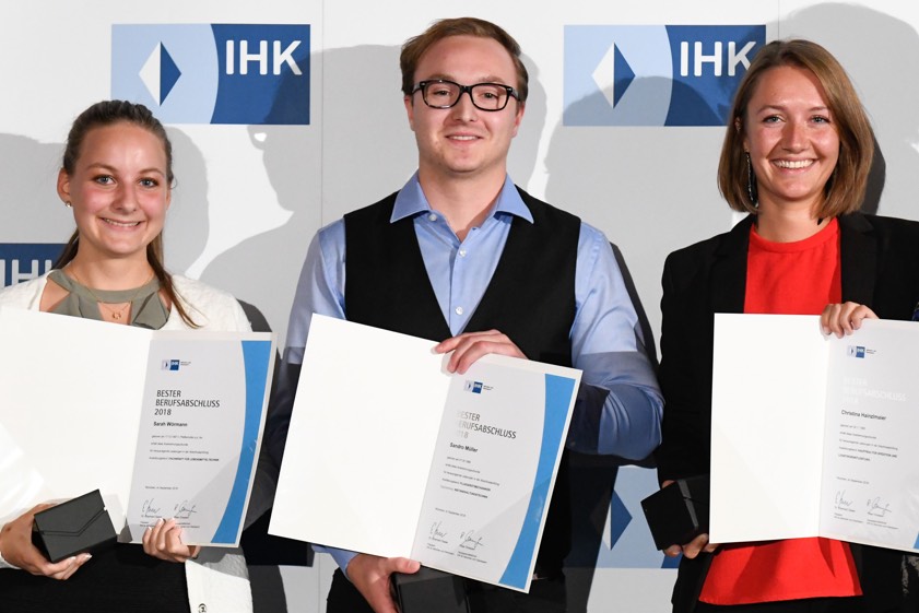Christina Hainzlmaier, Sandro Müller und Sarah Wörmann wurden von der IHK für ihre herausragenden Leistungen geehrt.