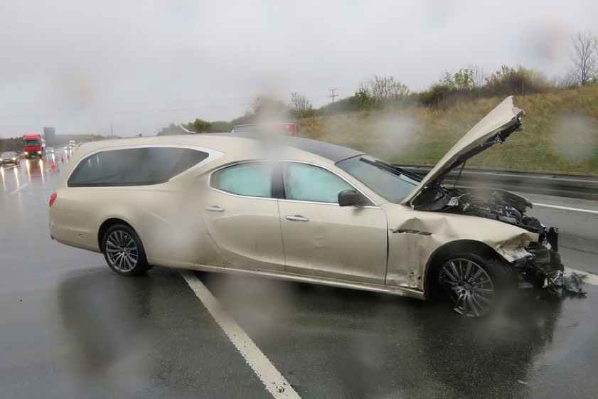 Der goldfarbene Maserati als Leichenwagen-Umbau war laut Verkehrspolizei gegen 9 Uhr auf der A9 von Carrara (Italien) nach Berlin unterwegs, um einen „standesgemäßen Auftrag“ zu übernehmen. Dazu sollte es allerdings nicht kommen, denn der 58-jährige Fahrer war wohl auf der nassen Strecke um einiges zu schnell unterwegs. „Zudem war die Bereifung der Luxuskarosse grenzwertig“, so ein Polizei-Sprecher. Der schwere Nobel-Schlitten geriet ins Schleudern, prallte mit der Front und dem Heck in die Leitplanken. Dabei sei der weit über 200 000 Euro teure Wagen erheblich beschädigt worden.