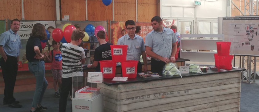 Der Besuch von Mögn war nicht das einzige Highlight, das die Ehrenamtlichen bei der Messe erlebten: Sie präsentierten stolz ihre Hochwasser-Ausrüstung und boten selbst gestaltete Löscheimer gegen eine kleine Spende an. Außerdem wurden allgemeine Infos über Rauchmelder oder die Oldtimer-Truppe der Wehr geboten. Und die Besucher konnten sich vor einer großen Fotowand, die den Hauptplatz in einem Überflutungs-Szenario zeigte, in Feuerwehr-Montur fotografieren lassen.