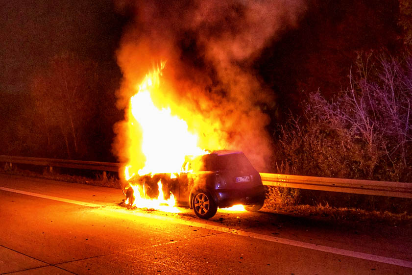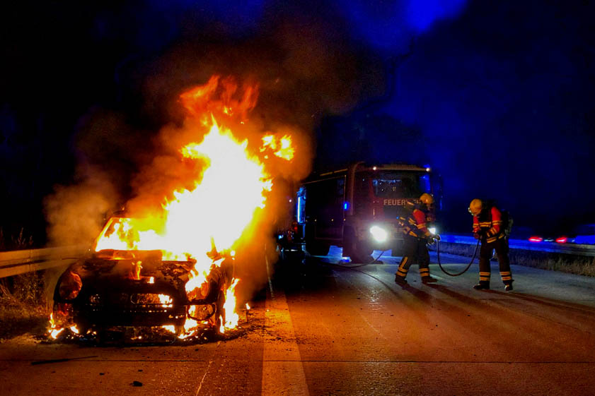(aa) Spektakuläre Szenen auf der A93 in Fahrtrichtung München: Zwischen Bad Abbach und Saalhaupt (Kreis Kelheim) stand gestern Abend ein Auto lichterloh in Flammen. Gegen 18.20 Uhr wurden die Freiwilligen Feuerwehren aus Pentling und Bad Abbach alarmiert. Als sie eintrafen, stand der dreitürige Mini bereits in Vollbrand. Die Flammen loderten einige Meter hoch in den Nachthimmel. Mittels massivem Schaumeinsatz konnte das Fahrzeug schließlich abgelöscht werden.