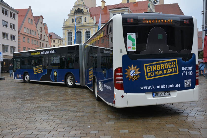 Das Polizeipräsidium Oberbayern-Nord startete im Jahr 2016 in Kooperation mit der Stadt Ingolstadt und den Ingolstädter Verkehrsbetrieben ein gemeinsames Präventions-Projekt zum Thema Einbruchschutz (Foto unten). Seit über zwei Jahren ist seither ein graphisch auffällig gestalteter INVG-Linienbus mit der Aufschrift "Einbrecher schlafen nicht" auf öffentlichen Nahverkehrsstrecken im Raum Ingolstadt unterwegs, um ganzjährige Präsenz in der Bevölkerung zu zeigen und Interesse am Einbruchschutz zu wecken. Ziel ist es nach Angaben der Beamten, möglichst viele Nutzer auf die kostenlosen Beratungsmöglichkeiten ("Wie sie ihr Heim besser schützen können") hinzuweisen.