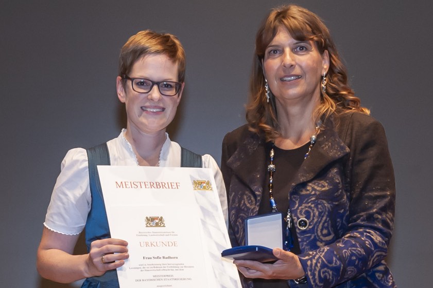 (ty) 93 Meisterinnen der Hauswirtschaft aus dem Freistaat haben im Tagungszentrum "Onoldia" in Ansbach ihre Meisterbriefe erhalten, darunter auch Sofie Badhorn aus Schweitenkirchen. Vom bayerischen Staatsministerium für Ernährung, Landwirtschaft und Forsten überreichte ihr die Leitende Hauswirtschafts-Direktorin Andrea Seidl den Meisterbrief und zeichnete sie sowie weitere 34 Meisterinnen und Absolventinnen der anderen hauswirtschaftlichen Fortbildungsberufe mit dem Meisterpreis der bayerischen Staatsregierung aus. "Dies ist ein Prädikat, das Ihnen bescheinigt, zur fachlichen Elite in der Hauswirtschaft zu gehören", lobte Seidl die Preisträgerinnen. Mit dem Meisterpreis wurden die 35 besten Prüfungsteilnehmer aller hauswirtschaftlichen Fortbildungsberufe geehrt.