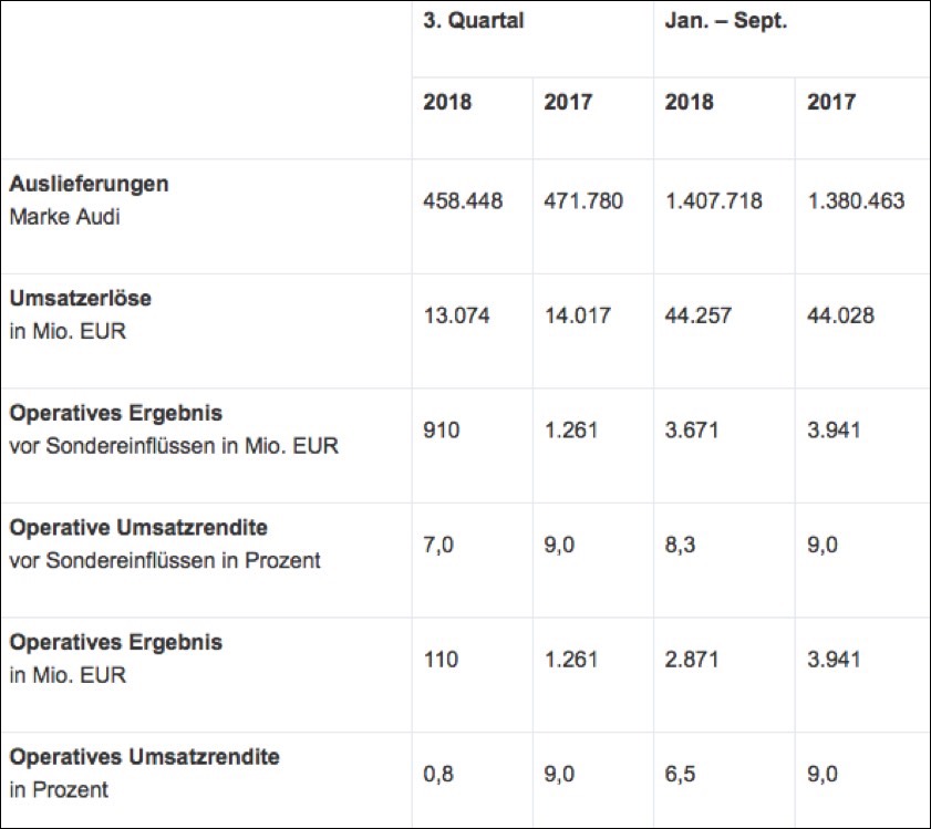 Im dritten Quartal lieferte Audi rund 458 450 Autos aus – im Vorjahres-Zeitraum waren es 471 780. Die Umsatzerlöse gingen auf 13,074 Milliarden Euro (Vorjahres-Zeitraum: 14,017 Milliarden Euro) zurück. Auch das operative Ergebnis vor Sondereinflüssen in Höhe von 910 Millionen Euro (1261 Millionen) spiegelt nach Angaben von Audi die im dritten Quartal besonders ausgeprägten Belastungen aus der WLTP-Umstellung wider. Die operative Umsatzrendite belaufe sich vor Sondereinflüssen auf 7,0 (9,0) Prozent. Nach den negativen Sondereinflüssen aus dem Bußgeldbescheid der Staatsanwaltschaft München II liege das operative Ergebnis für das Quartal bei 110 Millionen Euro, die operative Umsatzrendite damit bei 0,8 Prozent.