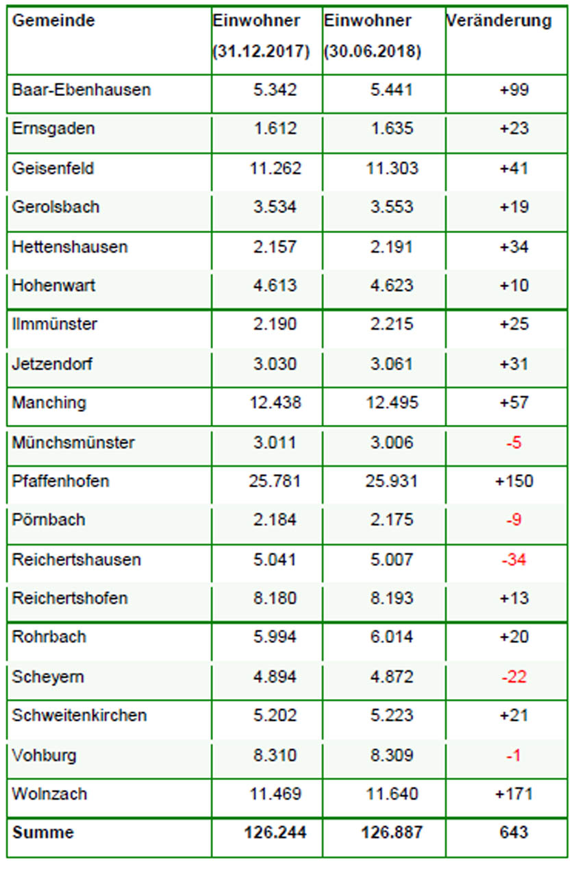 Nach absoluten Einwohnerzahlen gab es von Beginn des Jahres bis Ende Juni in der Gemeinde Wolnzach den stärksten Zuwachs. Hier war ein Plus von 171 Einwohnern zu verzeichnen. Dahinter folgen die Stadt Pfaffenhofen (plus 150 Einwohner) und die Gemeinde Baar-Ebenhausen (99). Mehr Einwohner gibt es außerdem im Markt Manching (57), in der Stadt Geisenfeld (41) und der Gemeinde Hettenshausen (34). Die Stadt Pfaffenhofen bleibt natürlich die einwohnerstärkste Kommune im Landkreis. Die Einwohnerzahl beträgt hier zum Stichtag 25 931.