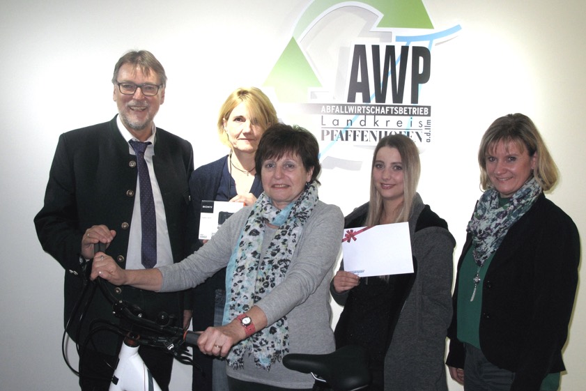 (ty) Über 800 Besucher nahmen am Quiz des Abfallwirtschaftsbetriebs des Landkreises Pfaffenhofen (AWP) bei der diesjährigen Messe "Gutleben.Gutwohnen" in Pfaffenhofen teil. Landrat Martin Wolf (CSU) und AWP-Werkleiterin Elke Müller überreichten jetzt die Preise an die Gewinnerinnen (Foto oben). Den ersten Preis, ein Fahrrad, erhielt Berta Herker aus Pfaffenhofen. Den zweiten Preis, einen Reisegutschein im Wert von 400 Euro, gewann Tina Brunthaler aus Pfaffenhofen. Der dritte Preis, eine Digitalkamera, ging an Britta Dörner aus Reichertshofen.