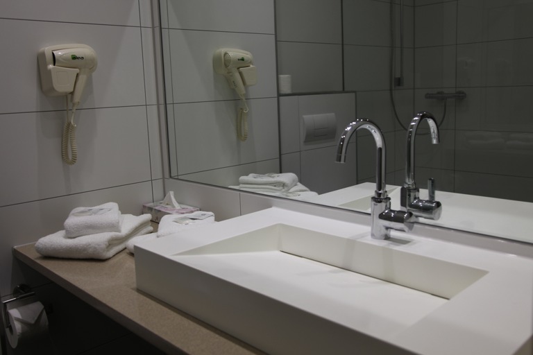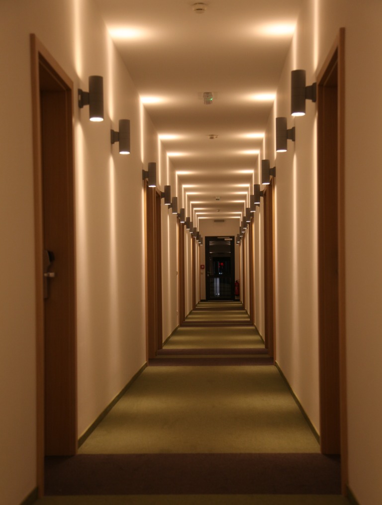 Das Hotel entspricht, wie Apfl erklärt, der gehobenen Drei-Sterne-Kategorie. Vor dem Haus gibt es kostenlose Parkplätze, drinnen Gratis-WLAN. Jedes Gästezimmer verfügt über einen Flachbildfernseher mit mindestens 80 Zentimeter Diagonale, jedes Bad ist über fünf Quadratmeter groß. Das Haus selbst mit seiner auffallenden Optik wurde in energiesparender Bauweise errichtet, für die Beleuchtung sorgen durchgehend LEDs.