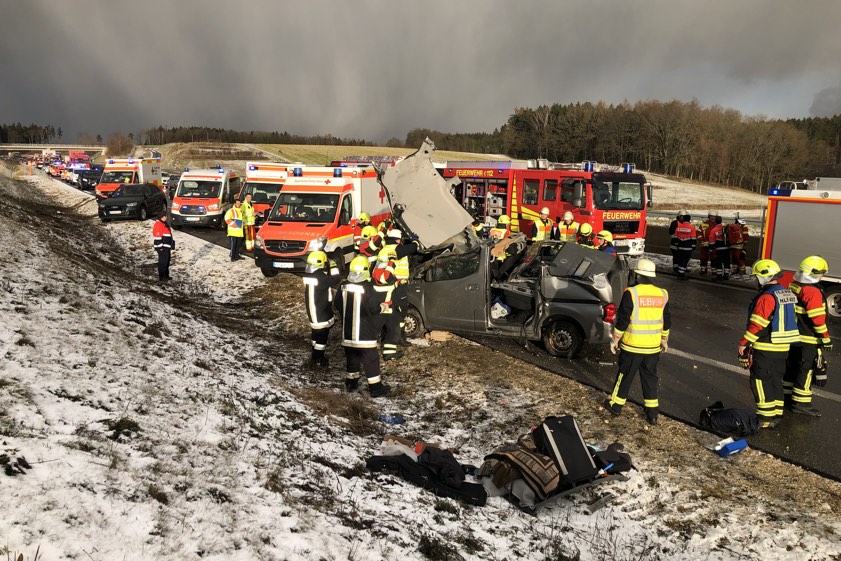 (aa) Auf der Bundesstraße B15n bei Schierling (Kreis Regensburg) ist es am heutigen Nachmittag kurz nach 14 Uhr zu einem schweren Unfall gekommen (Foto oben). Nach ersten Informationen schleuderte ein Pkw – besetzt mit zwei Erwachsenen und zwei Kindern – wohl wegen Glätte von der schneebedeckten Straße und überschlug sich mehrfach. Die Verunglückten mussten von den zahlreichen Einsatzkräften mit Hilfe von schwerem Gerät aus dem Wrack befreit werden. Auch ein Rettungshubschrauber war angerückt, um eines der verletzten Kinder ins Krankenhaus zu bringen. Inzwischen liegt ein Artikel mit neuen Informationen vor.
