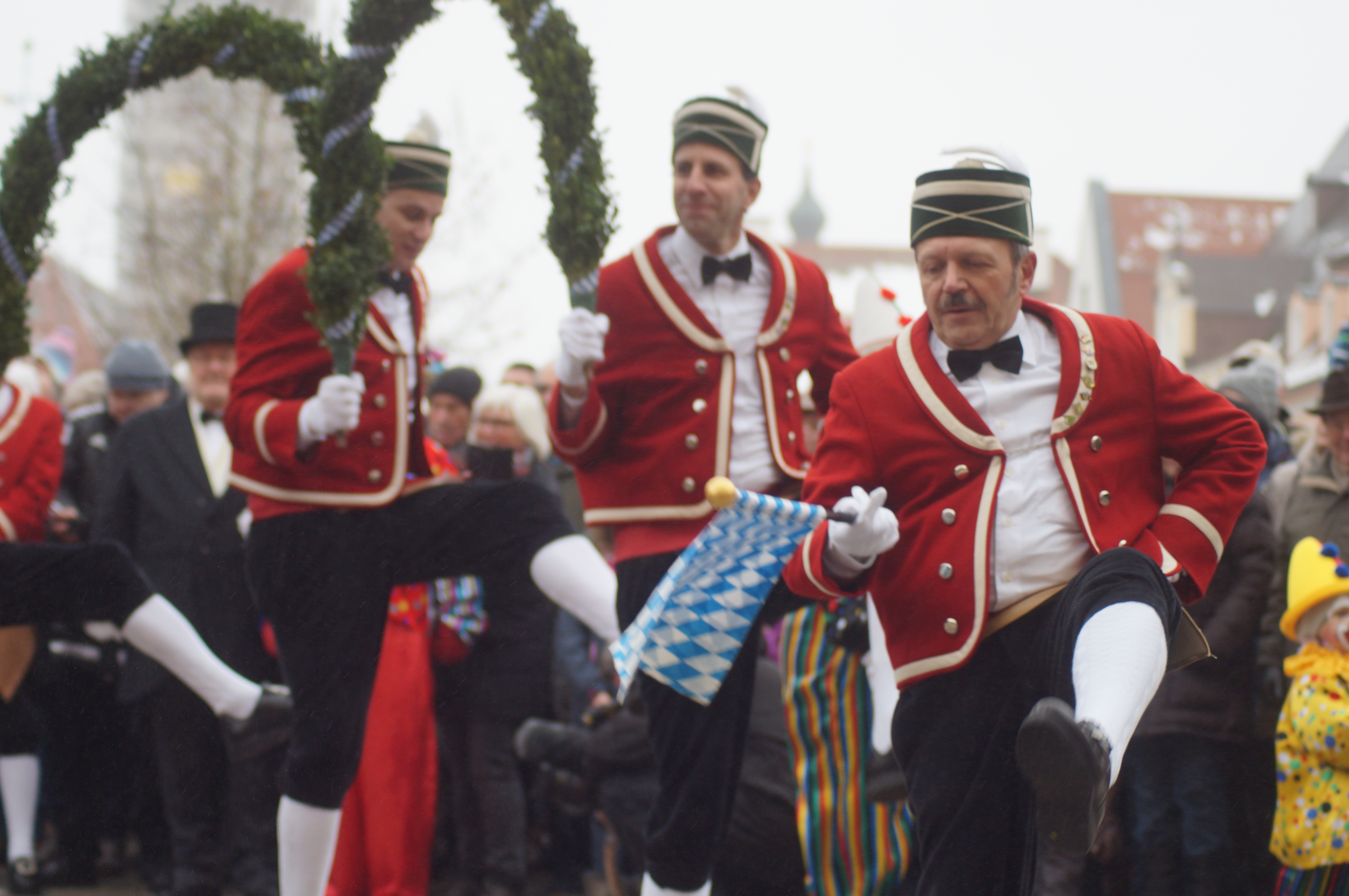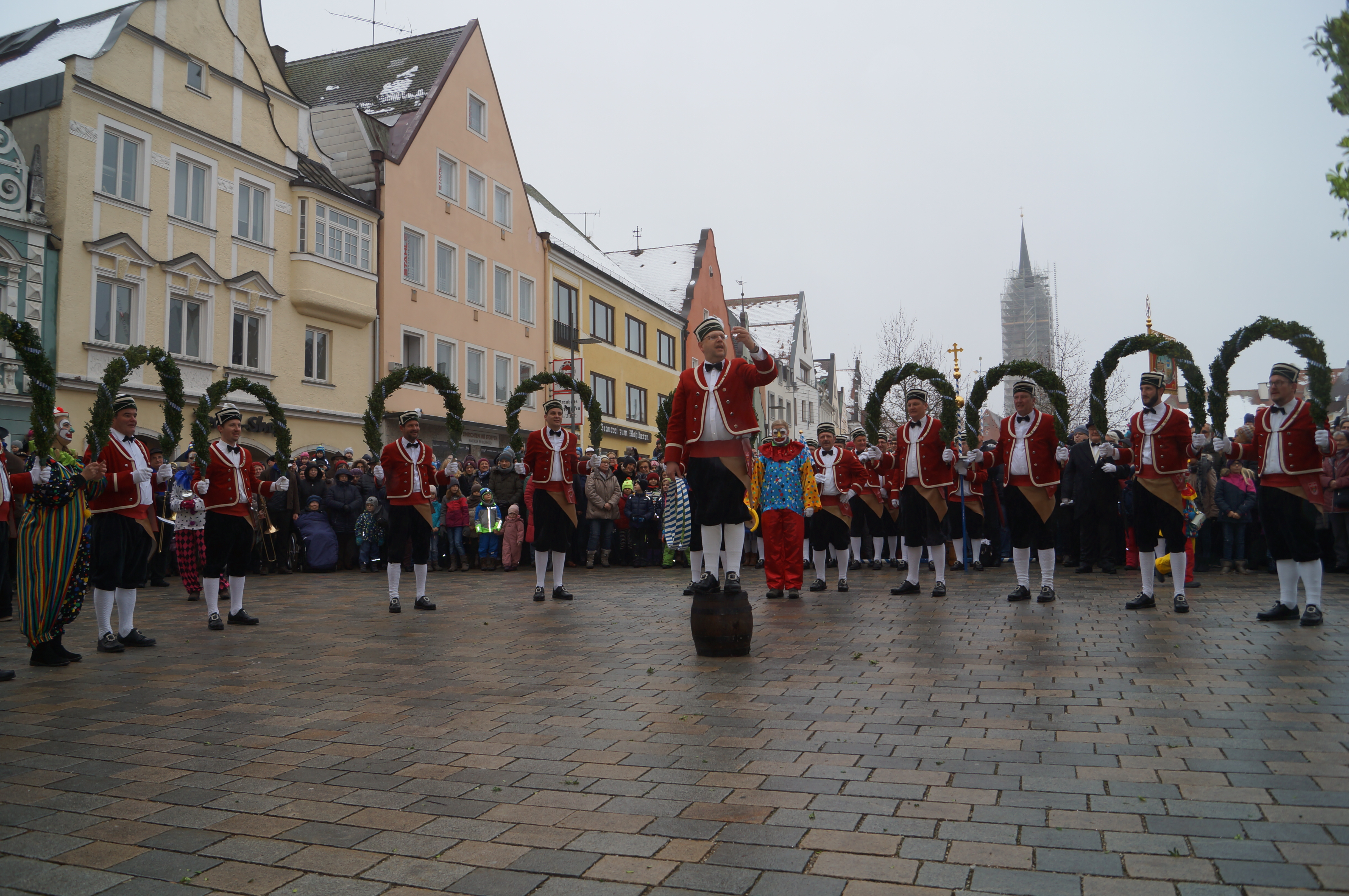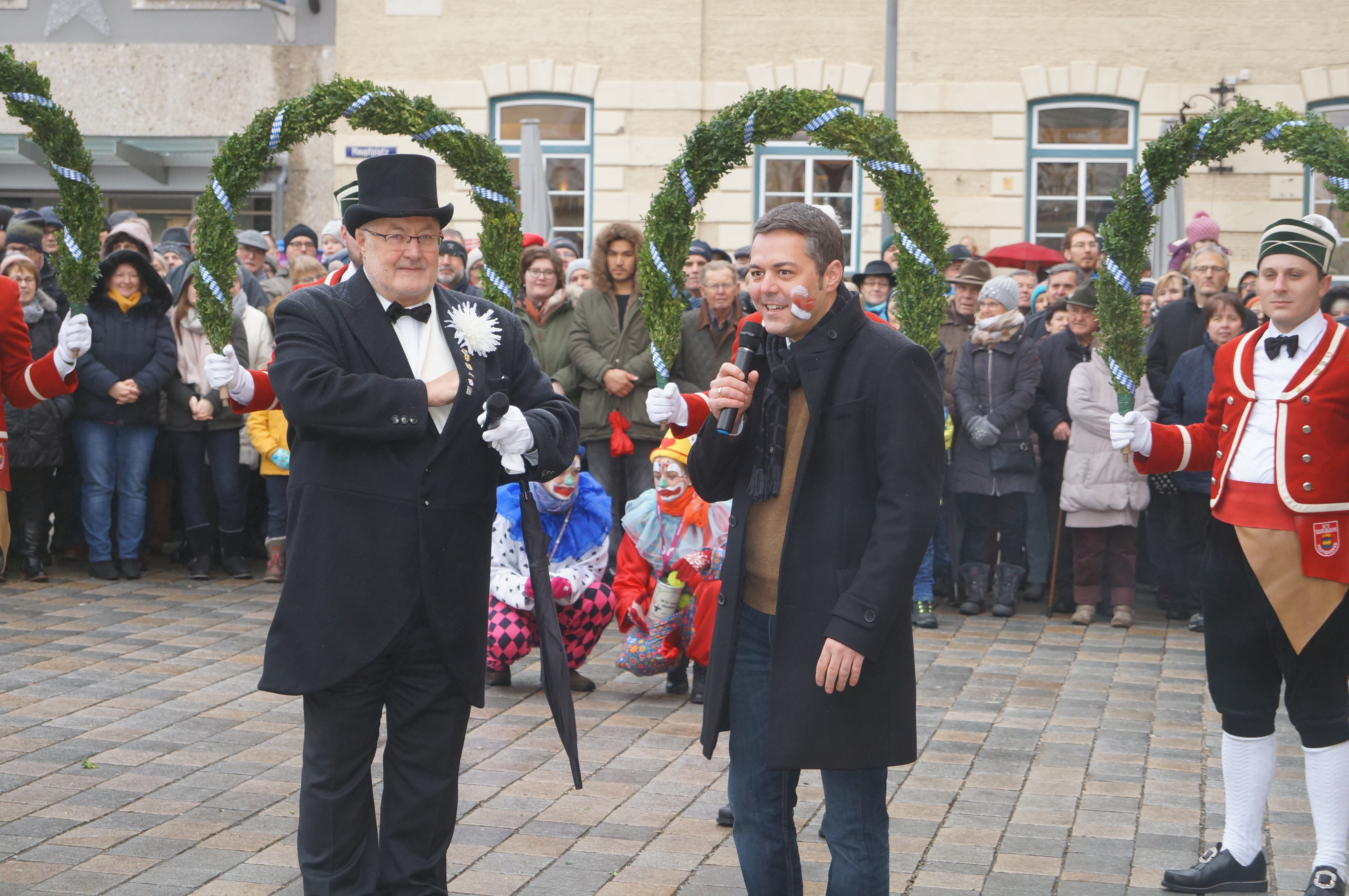 (akl) Alle sieben Jahre dürfen sie nur ran – dementsprechend groß war die Freude bei den Schäfflern und Kasperln des MTV Pfaffenhofen, als sie heute endlich wieder tanzen konnten. Zwar meinte es das Wetter bei leichtem Nieselregen und Temperaturen um die 0 Grad Celsius nicht unbedingt gut. Wie Pfaffenhofens Bürgermeister Thomas Herker (SPD) bei seiner Begrüßungsrede am Hauptplatz aber bemerkte, werde es bei den kommenden rund 170 Auftritten in der Region aber mit Sicherheit einige Male noch kälter werden.