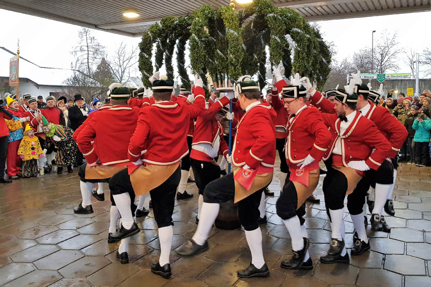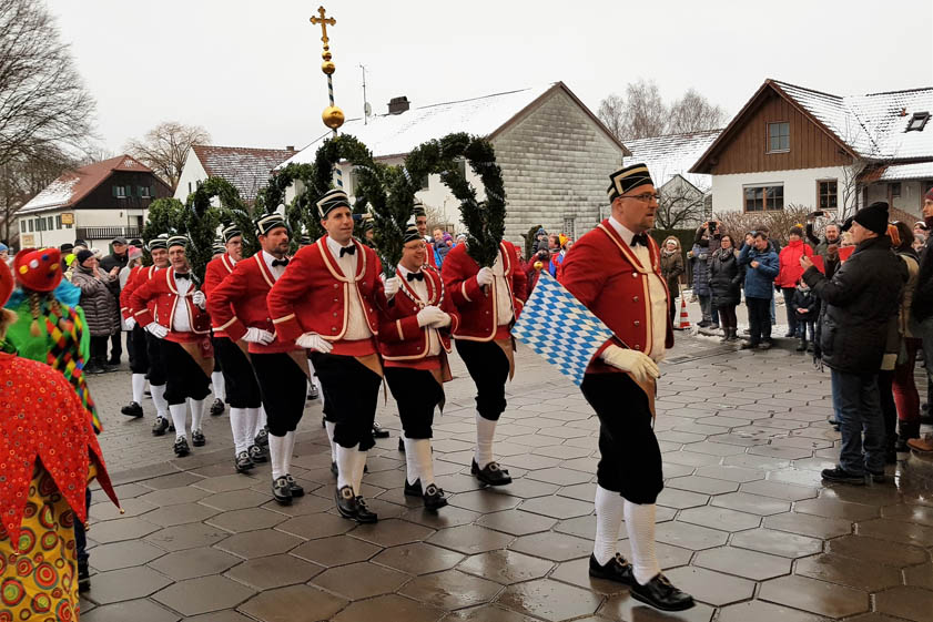 (ty) Die Uraufführung des Schäfflertanzes 2019 um 14 Uhr am Pfaffenhofener Hauptplatz (Hier geht's zur Bilder-Galerie) war noch von Nieselregen gesegnet, die Premiere in Mitterscheyern am späteren Nachmittag (siehe Fotos) allerdings gut bedacht: Die Brüder im Kranz präsentierten ihren traditionellen Tanz trockenen Fußes an der Tankstelle Mauermayer und Jäger. Weit über 200 Mitterscheyrer und Scheyrer waren gekommen, an der Spitze Bürgermeister Manfred Sterz (FW). Dazu gesellten sich etliche Pfaffenhofener. Tankstellen-Chef Mike Jäger, zugleich Vorsitzender des Gewerbevereins von Scheyern, begrüßte die vielen Gäste und das Schäfflerteam.